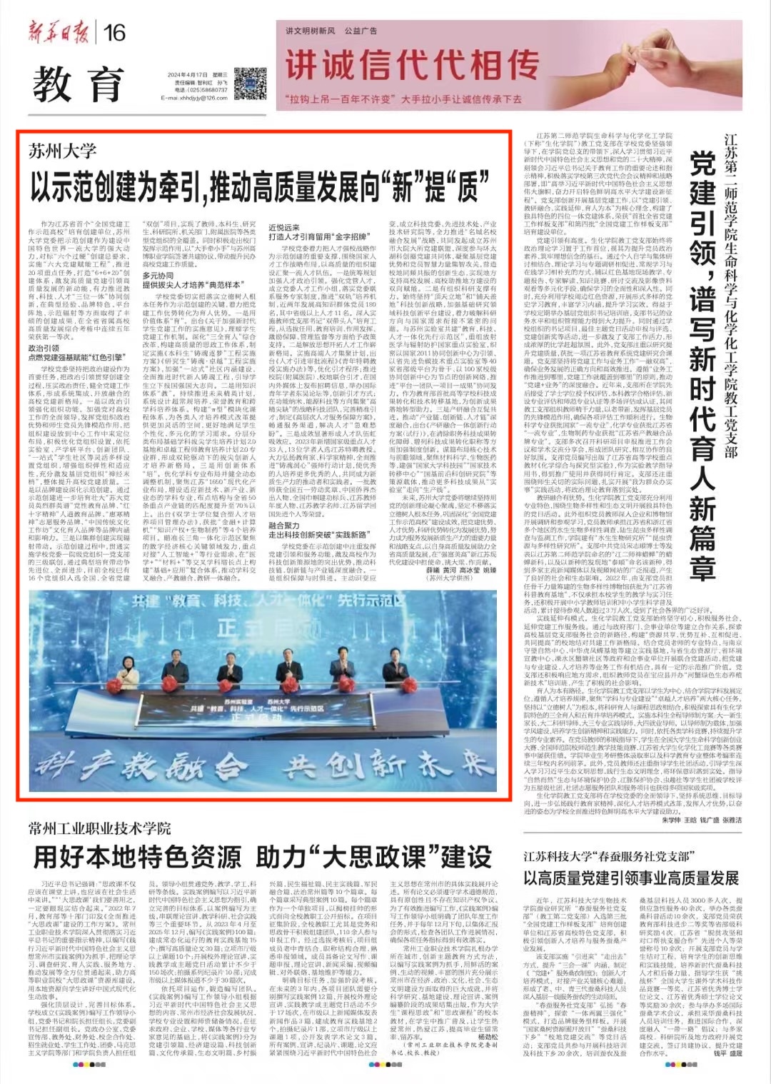 未来,苏州大学党委将继续坚持用党的创新理论凝心聚魂,坚定不移落实立德树人根本任务,巩固深化“全国党建工作示范高校”建设成效,把党建优势、人才优势、科研优势转化为发展优势,努力成为服务发展新质生产力的重要力量和战略支点,以自身高质量发展助力全省高质量发展,在“强富美高”新江苏现代化建设中担使命、挑大梁、作贡献。