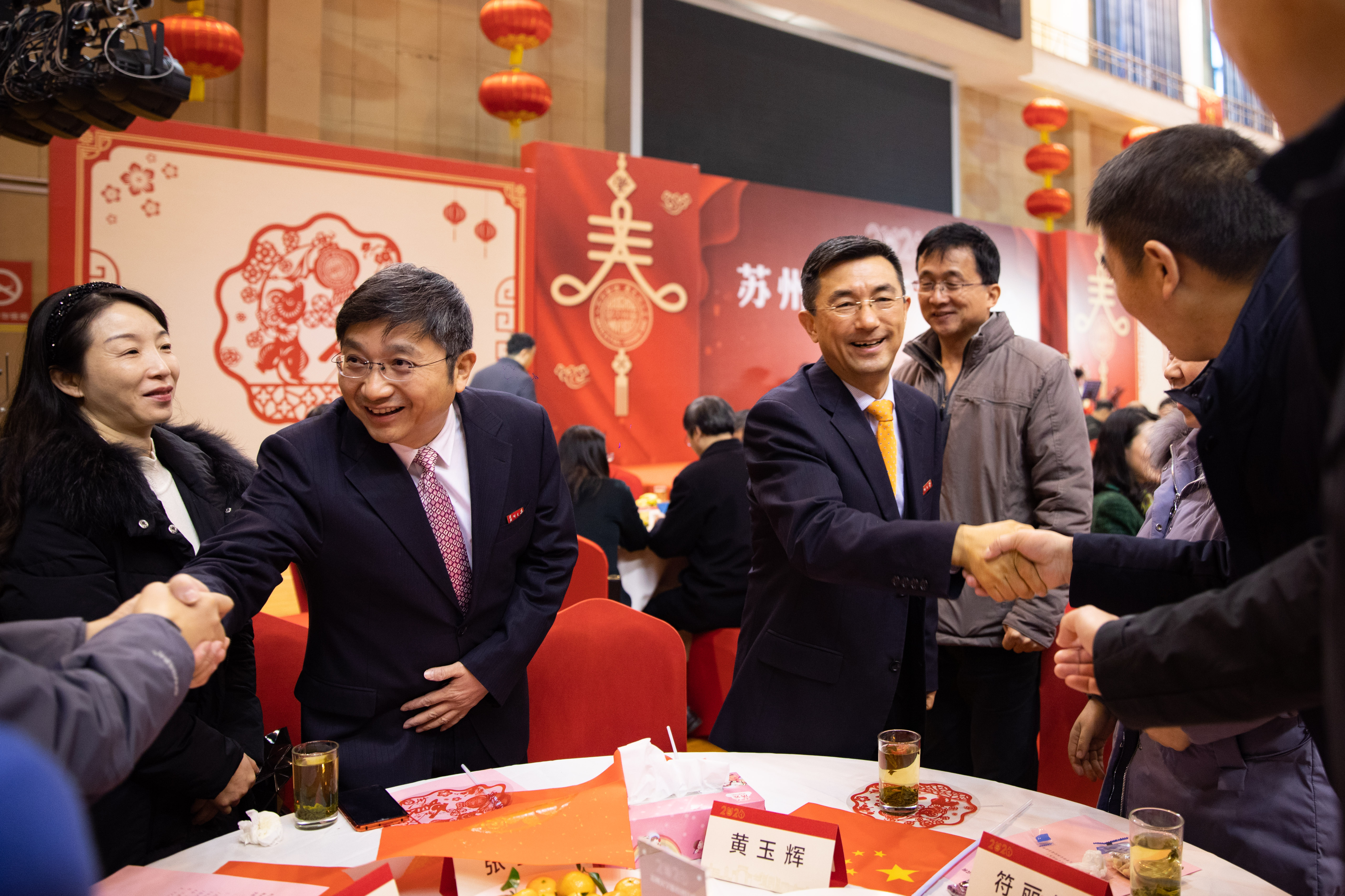 1月11日,苏州大学2020年新春团拜会在天赐庄校区东区体育馆举行,会上大家欢聚一堂,共话学校未来发展。全体校领导、退职校领导,退休省管干部、离休干部,院士或院士家属,十九大代表、市级及以上人大代表,统一战线代表,校学术委员会委员、校学位评定委员会委员,校党委委员、纪委委员,各学院(部)(含独立学院)、职能部门、直属单位主要负责人,直属附属医院主要负责人、医师代表、护士代表,教师、本科生、研究生、留学生代表,校友代表,以及后勤物业代表等出席了本次活动。团拜会由校党委书记江涌主持。