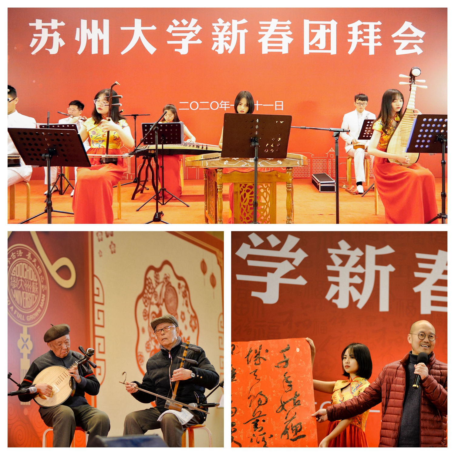 团拜会现场,东吴艺术团、音乐学院、离退休工作部(处)、国际合作交流处、海外教育学院、艺术学院等学院(部)及相关职能部门师生为大家带来了精心准备的文艺表演。文艺表演环节中,主持人采访了部分师生代表,他们讲述了自己过去一年不平凡的追梦之旅和心路历程,深情表达了对学校的美好祝愿。