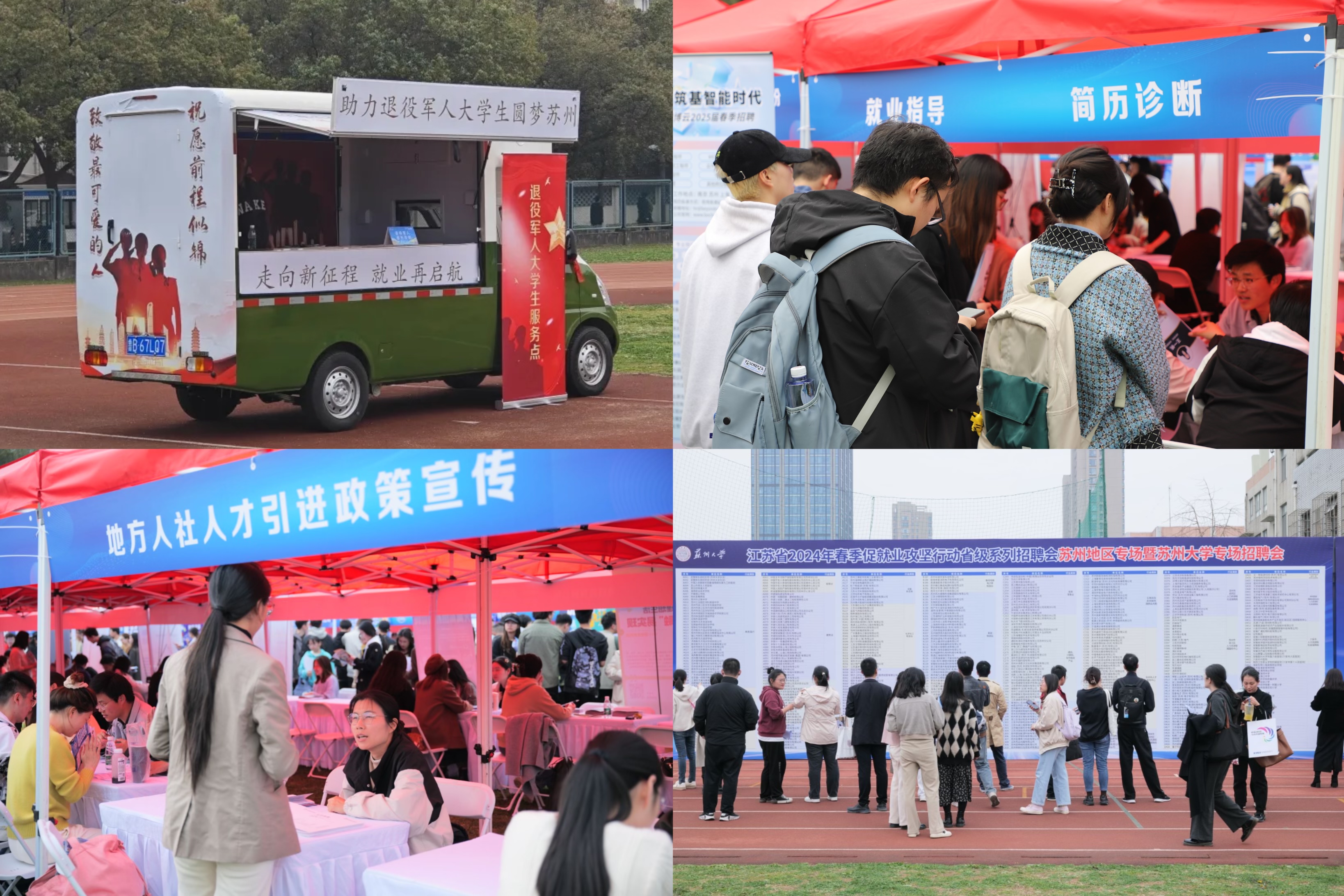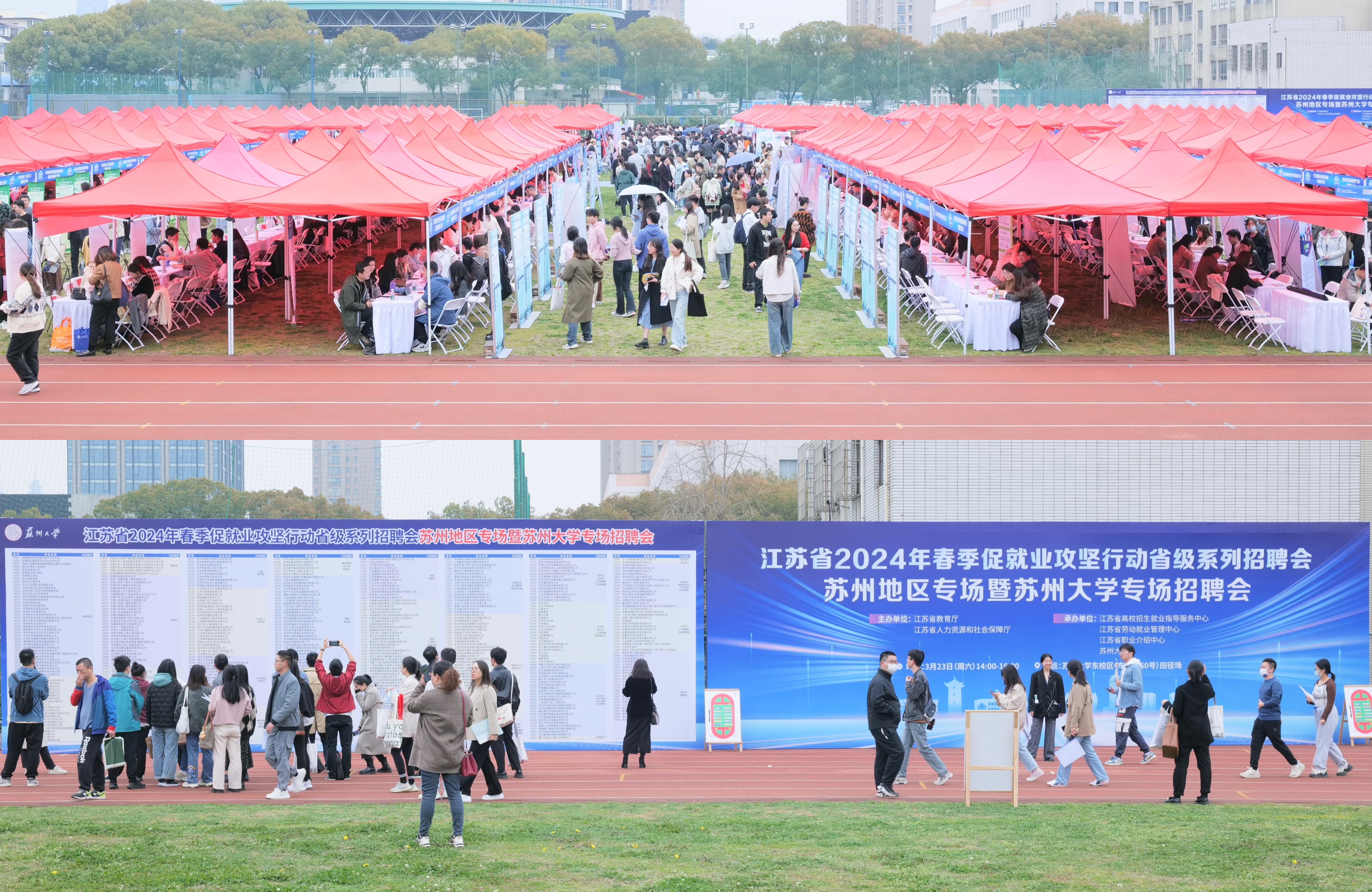 3月23日,江苏省2024年春季促就业攻坚行动暨苏州大学春季校园双选会在我校天赐庄校区东区田径场举办。此次双选会共有486家用人单位现场参会招聘,其中500强企业及上市公司占比达60%以上,招聘岗位数达2100余个,招聘人数22600余人,吸引了4000余名毕业生到场应聘。