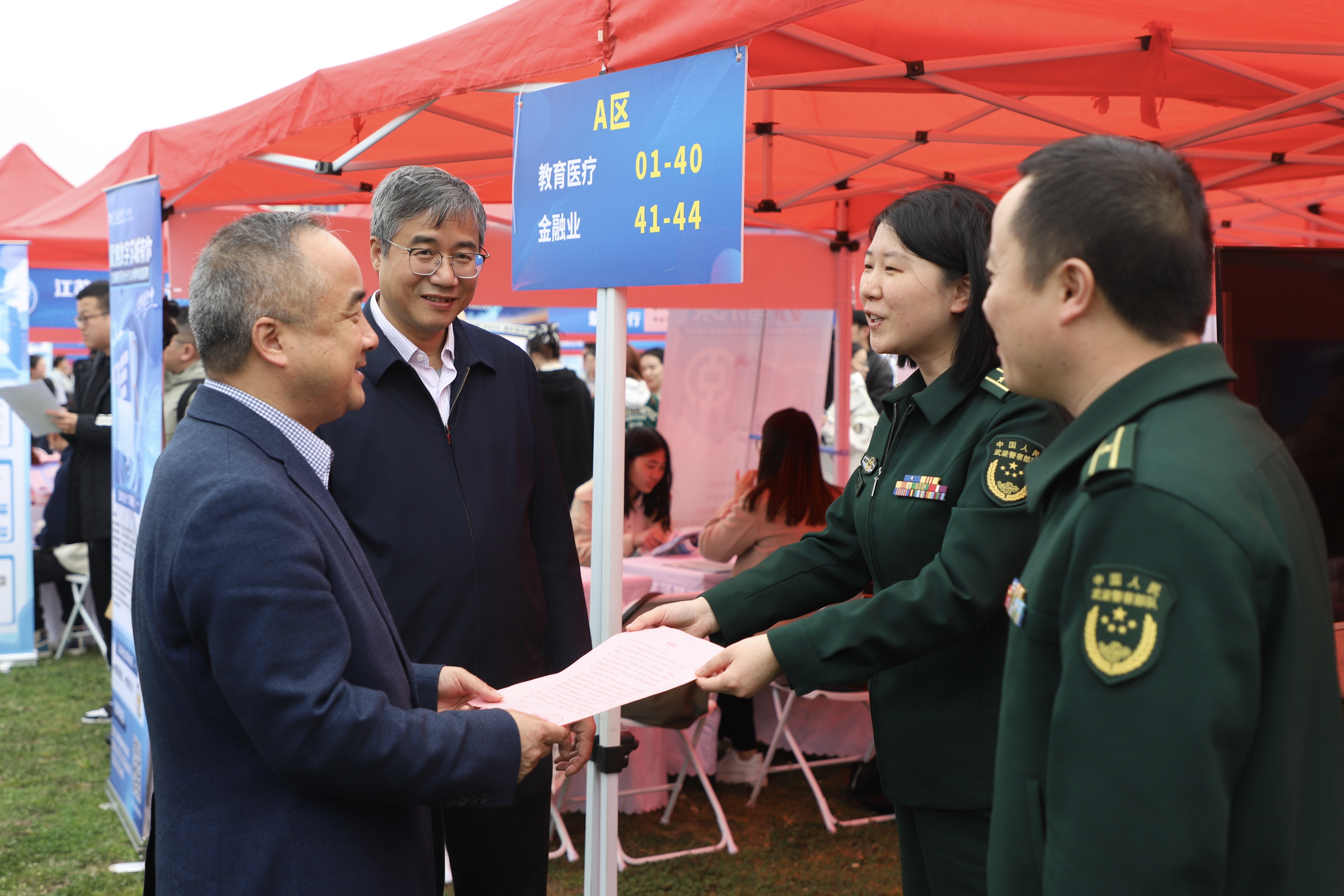 本次双选会现场特设了武警部队直招军官宣讲招聘展位和退役军人大学生服务点。在武警部队直招军官的展位前,胡建平和查佐明一行与武警苏州支队的警官就全军直招军官工作进行了深入交流。武警带队负责同志就学校对该项工作一直以来的大力支持向查佐明送出了感谢信。