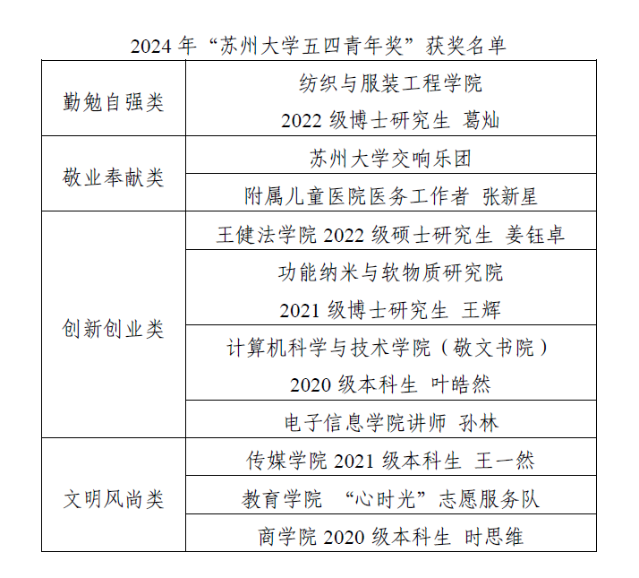党委办公室主任刘春雷宣读了“两红两优”表彰决定。五四青年奖评审委员会代表、党委教师工作部部长林萍宣读了2024年“苏州大学五四青年奖”“苏州大学五四青年奖·向上向善好青年”“苏州大学五四青年奖提名奖”表彰决定。邓敏为2024年“苏州大学五四青年奖”获奖代表颁发荣誉证书和绶带。
