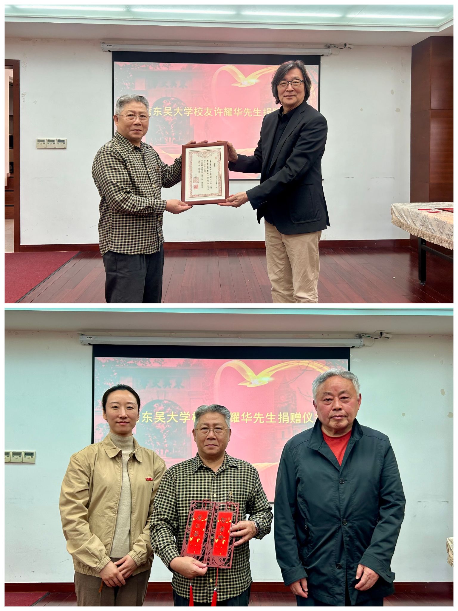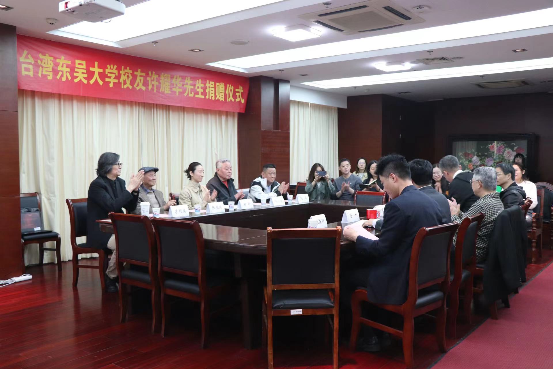 4月10日上午,台湾东吴大学校友许耀华先生捐赠仪式在我校博物馆会议室举行。校党委常委、副校长洪晔,国内合作发展处处长陆岸,博物馆名誉馆长张朋川,东吴书画研究院院长华人德,博物馆馆长李超德,苏州市博物馆协会副秘书长朱春阳,平江里艺术中心馆长陆中,以及博物馆全体工作人员和艺术学院学生代表参加捐赠仪式。仪式由博物馆常务副馆长冯一主持。