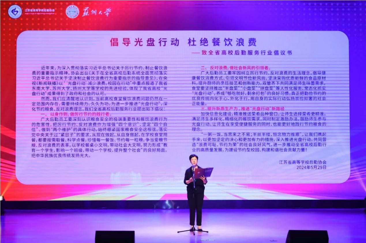 为深入贯彻落实习近平总书记关于厉行节俭、制止餐饮浪费的重要指示精神,会上,省高校后勤协会副会长、南京工业职业技术大学党委常委、副校长苏小冬宣读《倡导光盘行动 杜绝餐饮浪费》倡议书,并指出要进一步推进“光盘行动”,深化节约粮食、反对浪费理念。