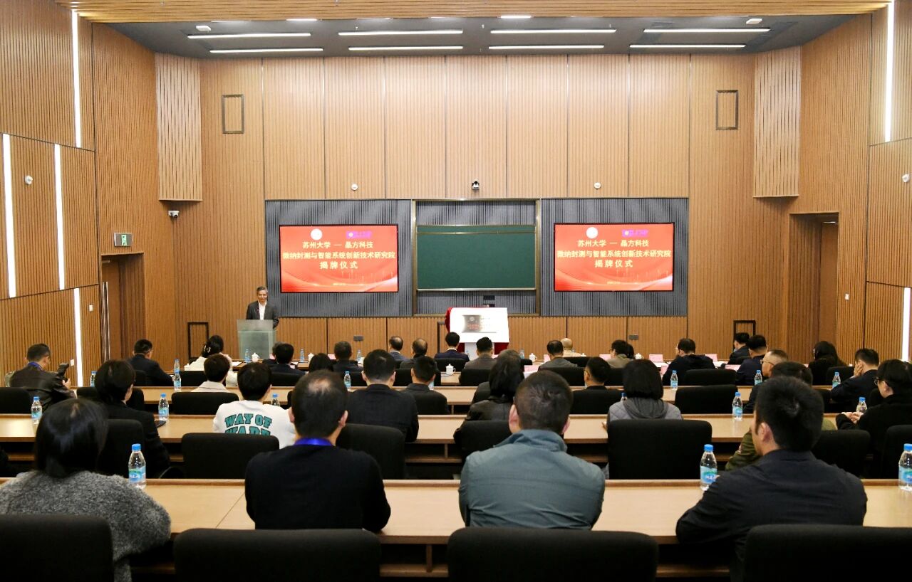 11月11日,在苏州市政协的积极推动下,我校机电工程学院与苏州晶方半导体科技股份有限公司合作,成立苏大晶方科技微纳封测与智能系统创新技术研究院,进一步深化名城名校融合发展,推动产业创新。苏州市政协主席朱民、秘书长吴炜,我校校长张桥,党委常委、副校长张正彪出席揭牌仪式。