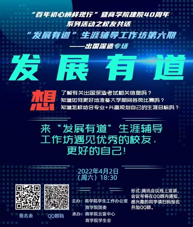 “百年初心榜样现行”暨商学院建院40周年系列活动之校友共话 “发展有道”生涯辅导工作坊第六期——出国深造专场