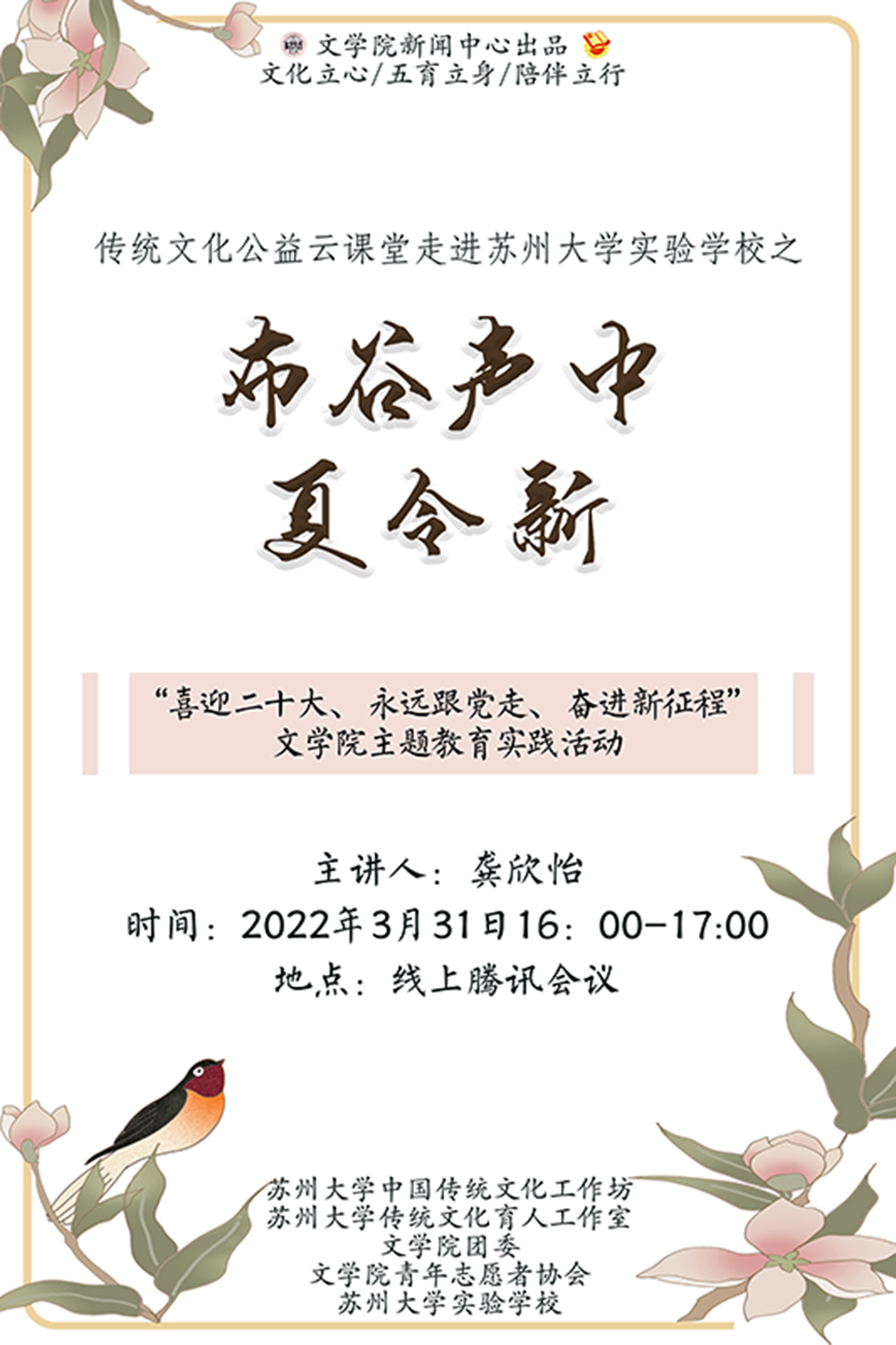 “喜迎二十大、 永远跟党走、 奋进新征程”文学院主题教育实践活动 传统文化公益云课堂走进苏州大学实验学校之“布谷声中夏令新”