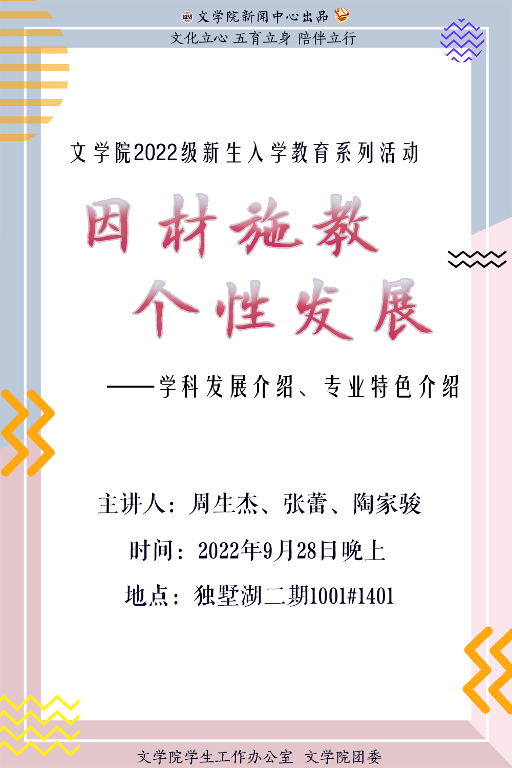 文学院2022级新生入学教育系列活动之“因材施教,个性发展”学科发展介绍、专业特色介绍