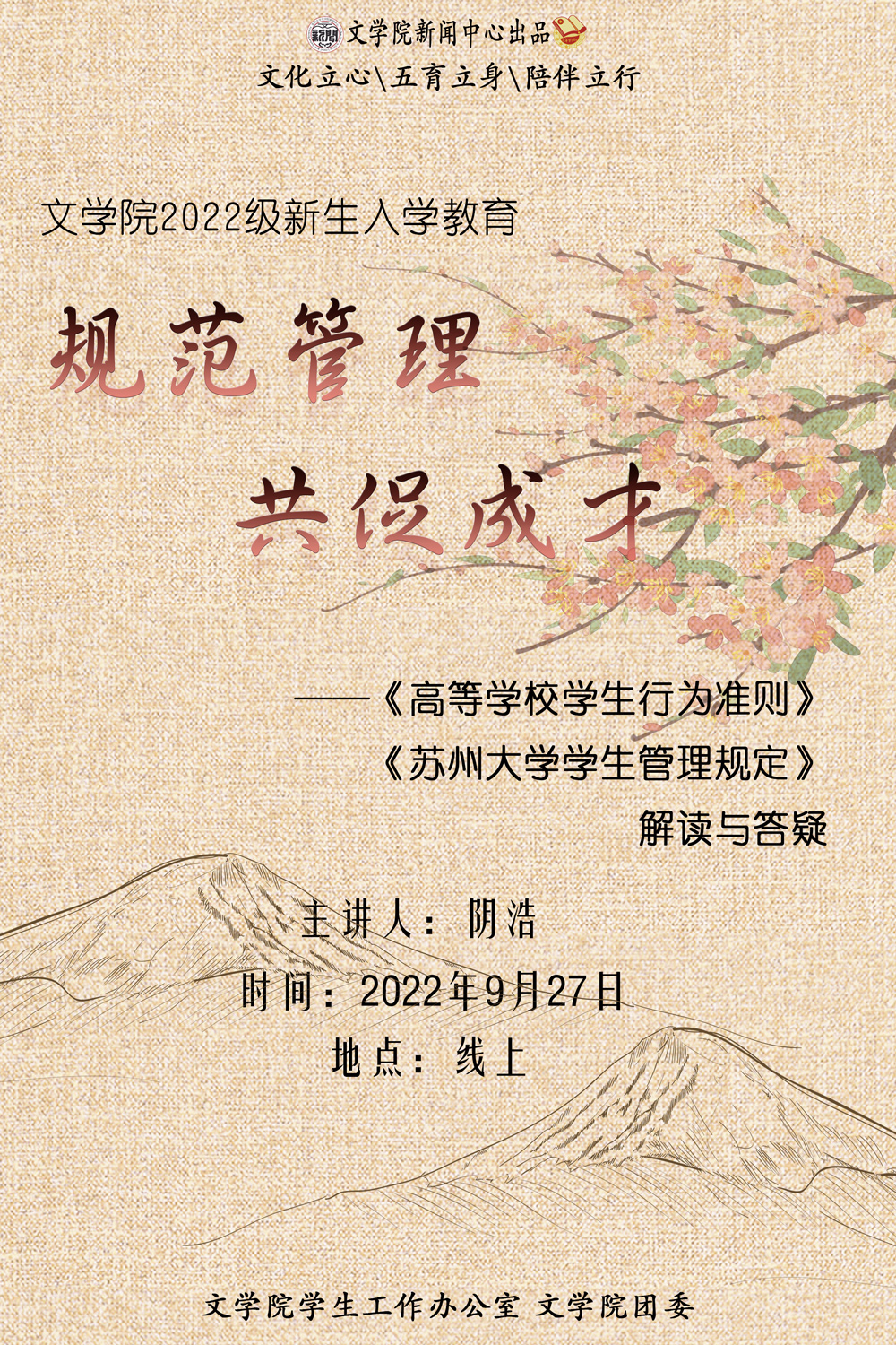 文学院2022级新生入学教育系列活动之规范管理,共促成才——《高等学校学生行为准则》《苏州大学学生管理规定》解读与答疑