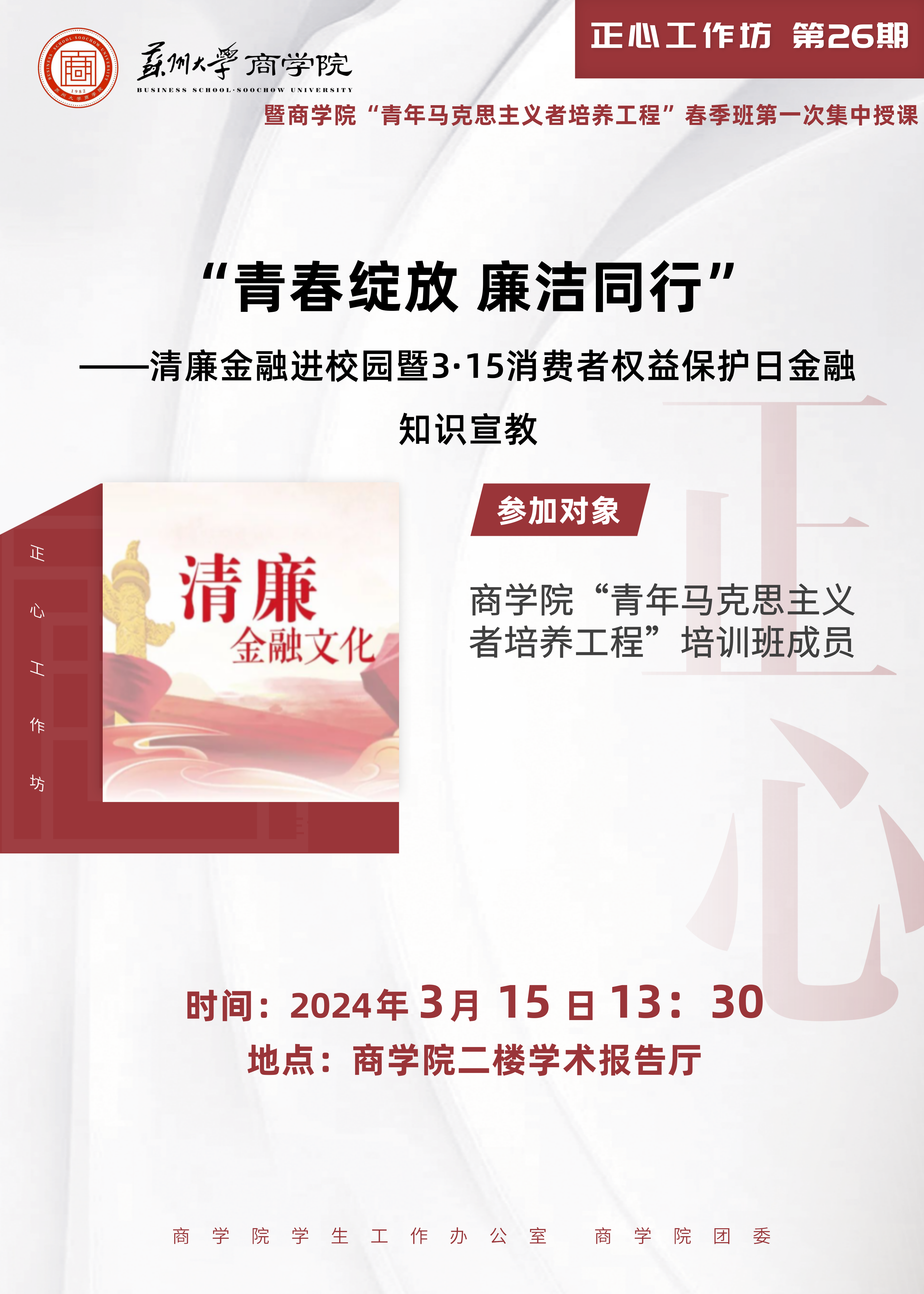 苏州大学商学院正心工作坊第26期暨商学院“青年马克思主义者培养工程”春季班第一次集中授课