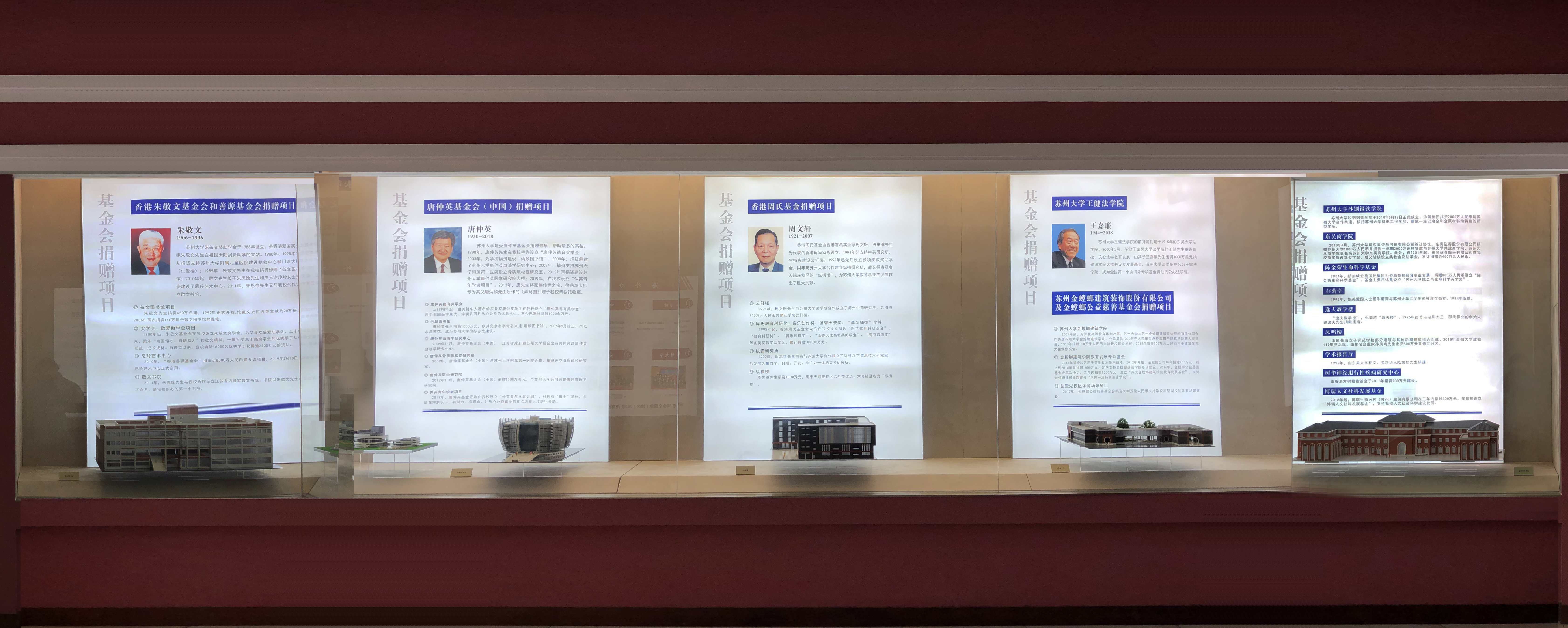 苏州大学的发展离不开社会各界的慷慨捐赠和热忱支持,为此,博物馆与校发展委员会办公室合作共建了捐赠展厅。展厅将朱敬文基金会、唐仲英基金会、香港周氏基金会、金螳螂公益慈善基金会等捐赠项目以及社会各界通过捐赠在我校设立的奖、助学金项目作了一一介绍,同时为敬文图书馆、恩玲艺术中心、炳麟图书馆、云轩楼、王健法学院、金螳螂建筑学院学术交流中心等标志性建筑专门制作了逼真的建筑模型,令观者赏心悦目。