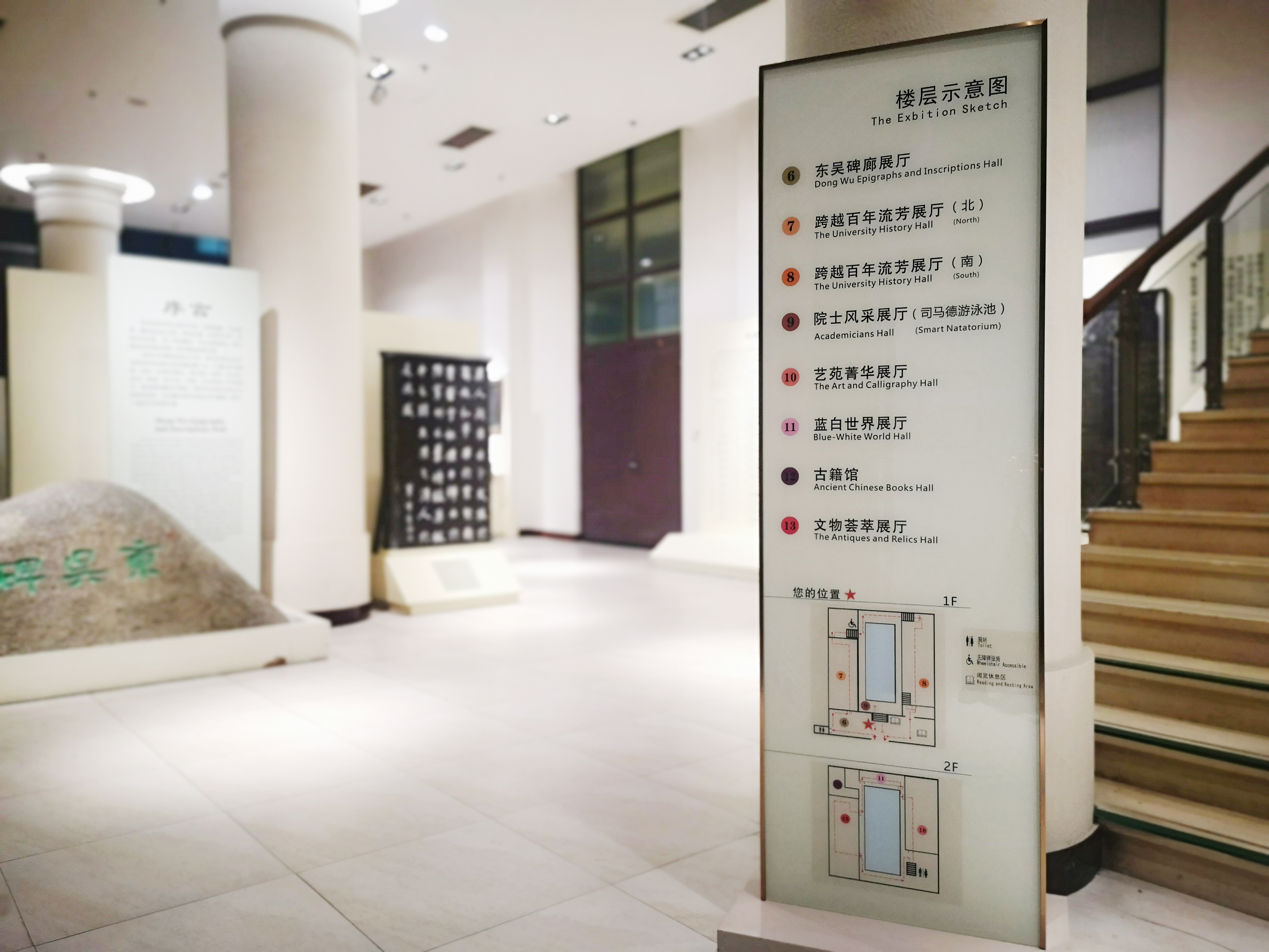 下半年在多个增设展厅相继开放后,为了方便初次来馆者浏览和参观,博物馆不仅重新规划了馆内的导览路线,将司马德游泳池展厅楼梯通道对外开放,同时在路口醒目位置重新设计并安放了导览图,又在地面醒目的路口处设置地标指引,使观者一目了然。