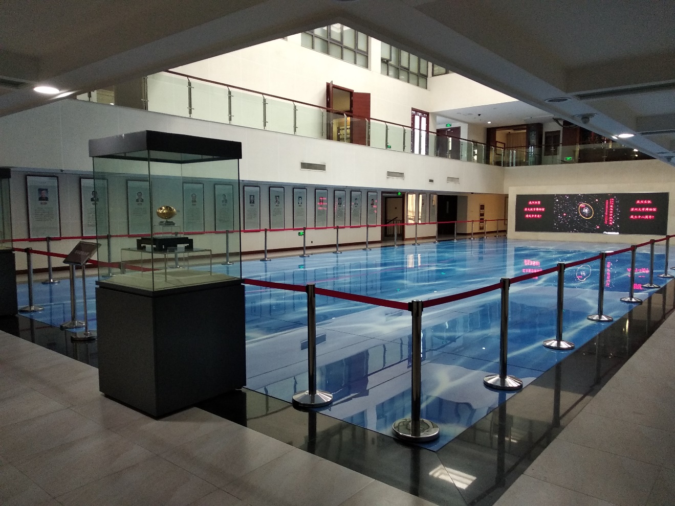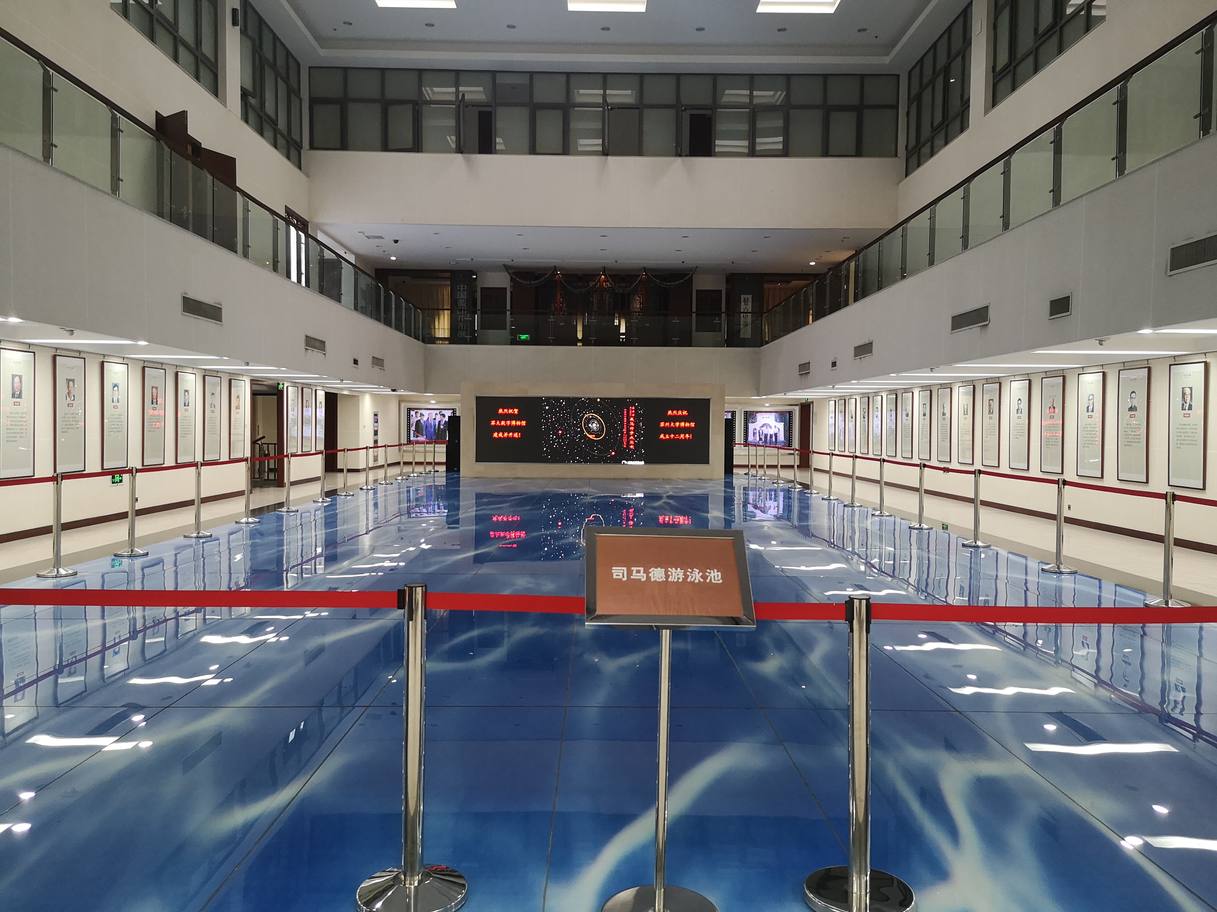 司马德游泳池展厅南北墙面原是滚动灯箱,经过设计改造后现已成为介绍苏州大学53位院士生平的特色展厅,明亮的顶部灯带与底部玻璃的蓝色波纹交相辉映,一幅幅院士的像片镜框齐正肃穆地环绕四周,场面壮观,令人竦然动容。