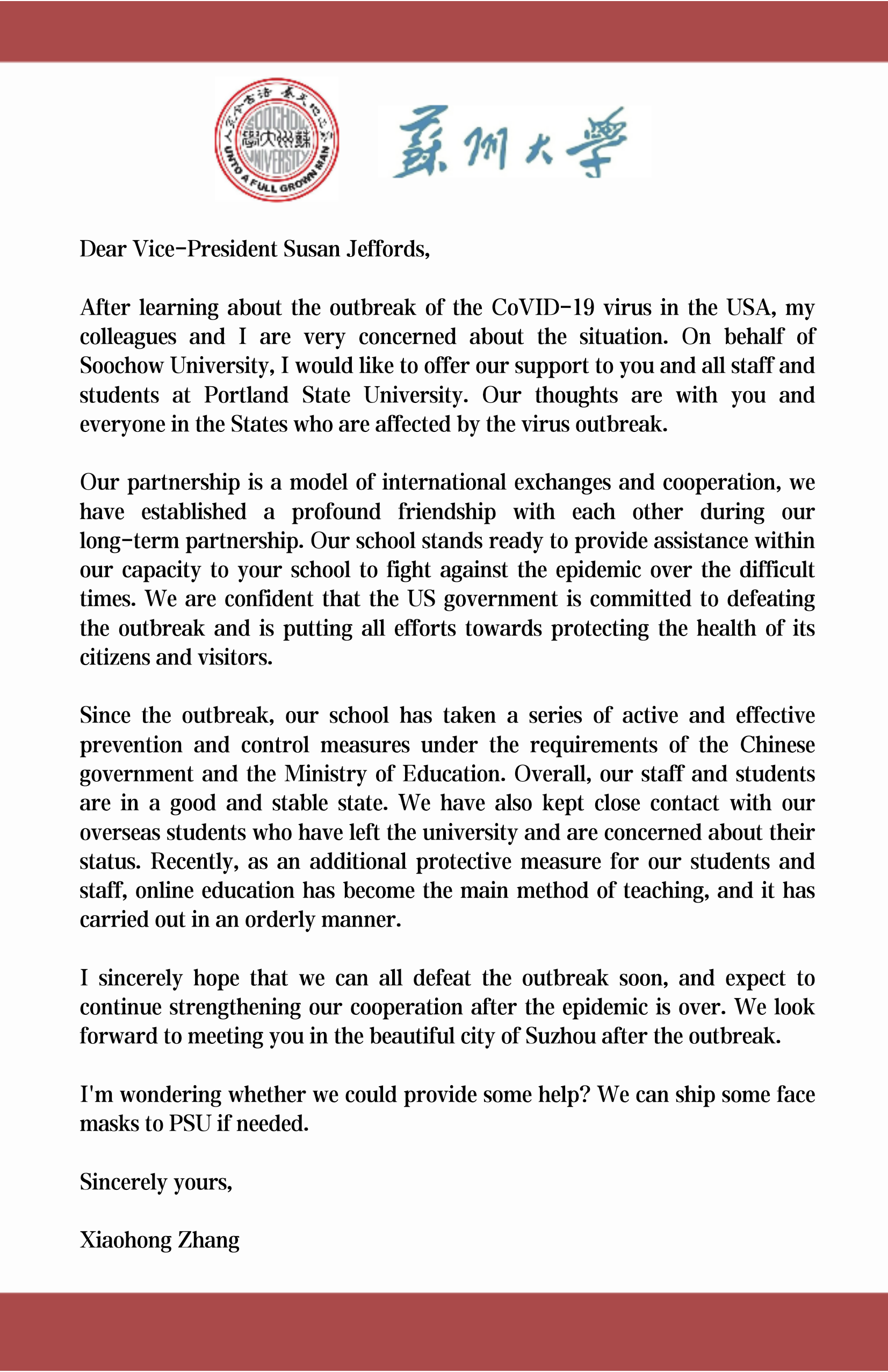 3月初,当美国俄勒冈州因疫情冲击而宣布进入紧急状态时,我校党委常委、副校长张晓宏在第一时间向波特兰州立大学教务长兼学术事务副校长Susan Jeffords致信问候,表达对波特兰州立大学全体师生的诚挚慰问,并表示苏州大学非常愿意助力波州大共渡难关。
