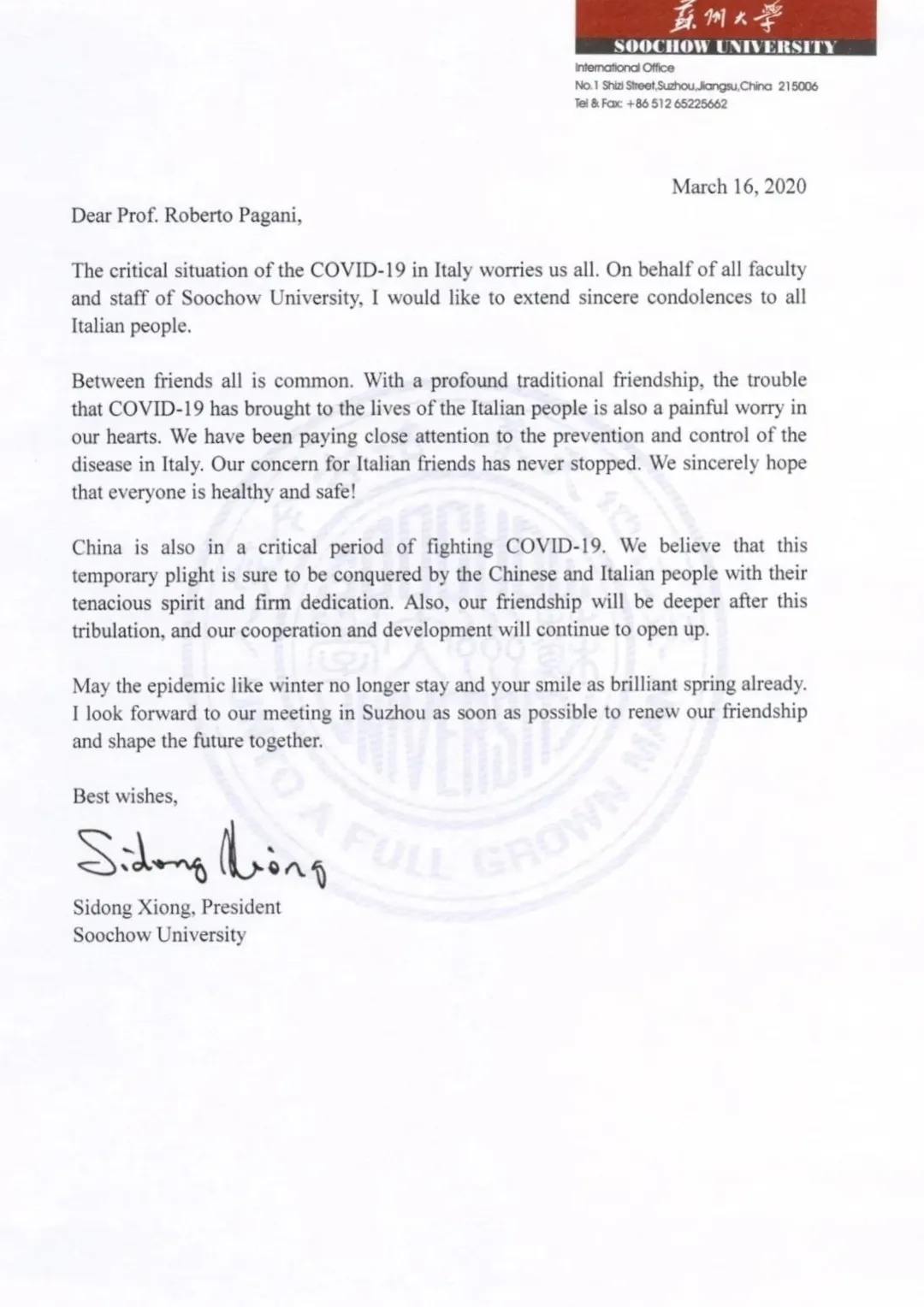 中意友谊源远流长,根基深厚。国内疫情爆发后,意大利驻沪总领事馆在第一时间致信熊思东校长表示慰问。疫情在意大利爆发后,熊思东校长也在第一时间致信问候意大利驻沪总领事馆科技参赞Roberto Pagani,信中表示,苏州大学全体师生深切地牵挂着处于危难时刻的意大利人民,希望意大利朋友们顽强奋战,早日战胜疫情!
