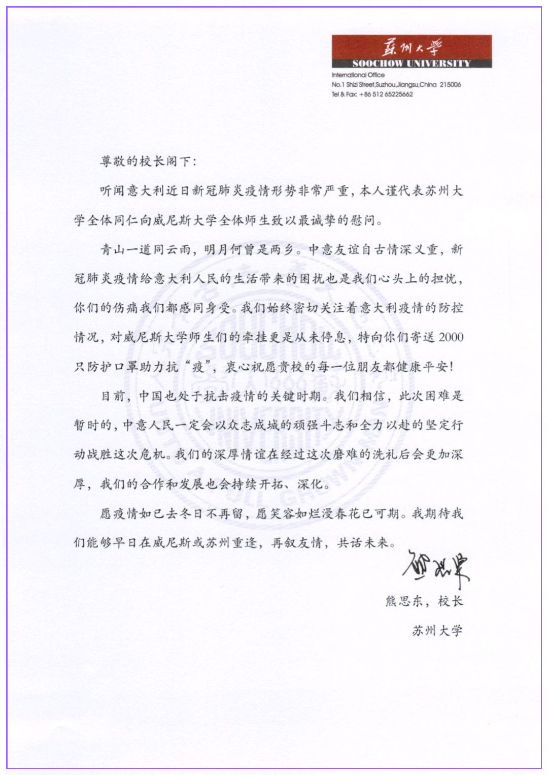苏州大学与威尼斯大学在2017年建立了战略合作伙伴关系。在意大利的疫情爆发以后,我校党委常委、副校长张晓宏在第一时间向威尼斯大学副校长Tiziana Lippiello发信慰问。在得知威尼斯大学防疫形势严峻,尤其物资紧缺的情况后,我校党委书记江涌和校长熊思东都万分挂念。熊思东校长代表我校全体师生向威尼斯大学校长Michele Bugliesi发去诚挚慰问,并表示急难有情,情有馀兮,苏州大学将提供支持,唯盼师生朋友安康无恙。