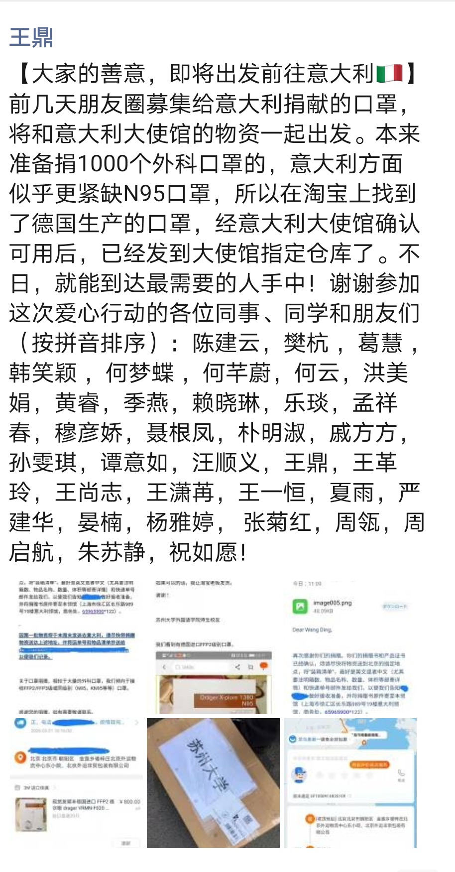 与此同时,我校各位师生也密切关注着意大利的疫情动态并积极开展口罩募捐活动。外国语学院师生及毕业院友在日语系主任王鼎的大力发动下,自主自发地募集了一批N95防护口罩,这批口罩已通过意大利驻沪总领事馆捐赠给威尼斯大学。