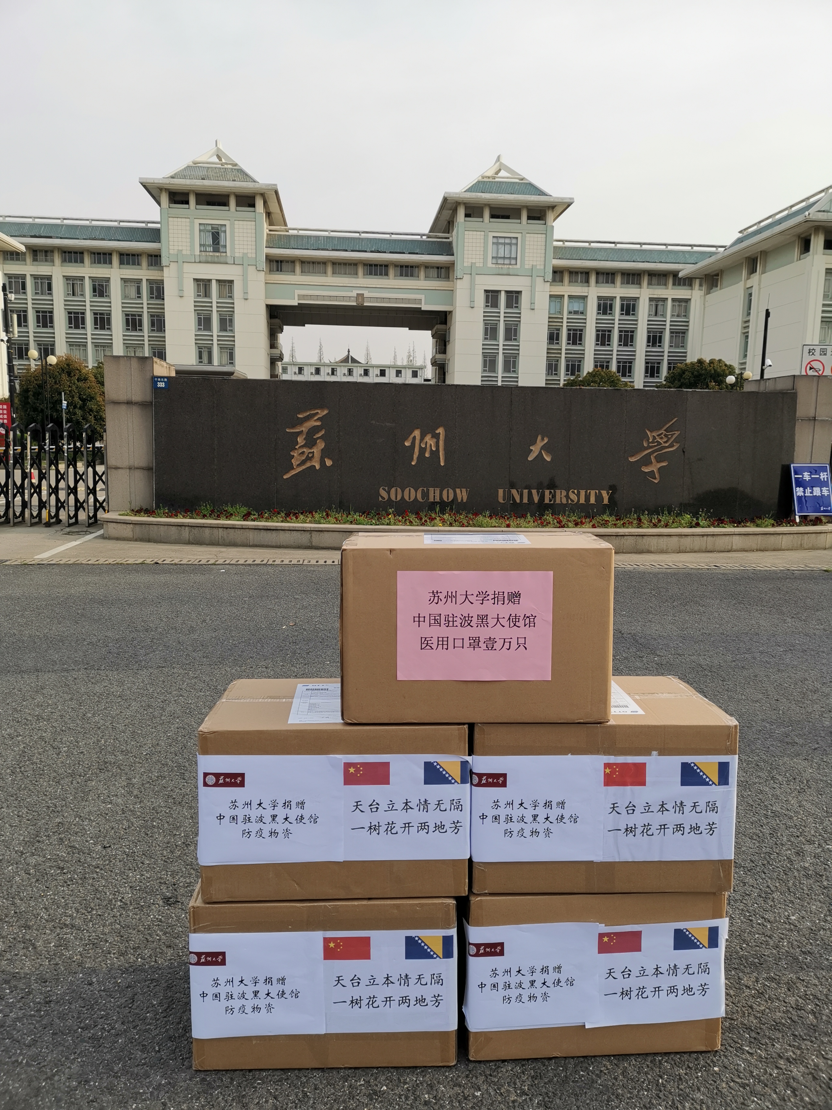 3月23日,一批标识“苏州大学捐赠中国驻波黑大使馆医用口罩壹万只”和附印“天台立本情无隔,一树花开两地芳”诗句的防疫物资由我校寄往波黑首都萨拉热窝。