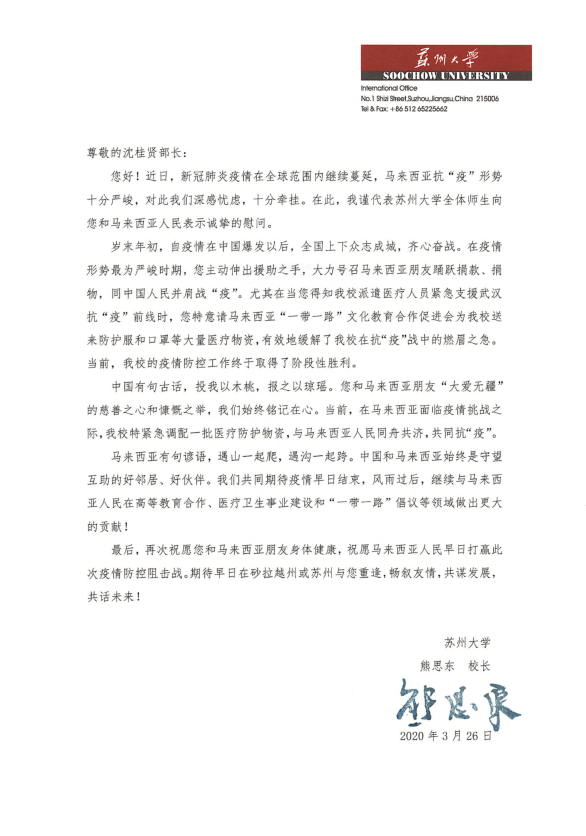 马来西亚砂拉越州地方政府及房屋部长拿督沈桂贤(Datuk Dr. Sim Kui Hian)一直关注着中国疫情的发展,他组织当地华人华侨积极为中国捐款捐物。当得知苏州大学派遣了大量医护人员前往湖北支援后,沈部长特意请马来西亚“一带一路”文化教育合作促进会为苏大送来防护服等医疗物资,并勉励苏大师生员工团结抗疫、共克时艰!