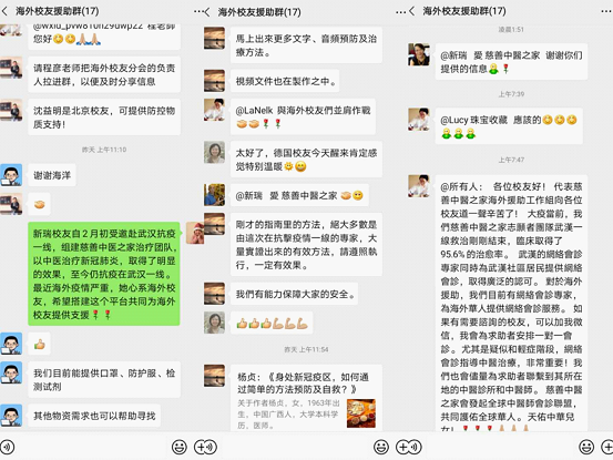 国内各校友组织除了积极响应校友总会发布的爱心动员令之外,还以多种方式热心支援海外校友。在校友总会组建的“苏州大学海外校友援助群”内,国内校友们利用自己掌握的丰富的防疫经验和广泛的物资采购渠道,在第一时间与海外校友们的防疫需求进行精准对接。比如,组建了“慈善中医之家”医疗团队并且亲赴武汉抗疫一线的校友戴新瑞,不仅毫无保留地与海外校友们分享自己在抗疫一线取得的成功救助经验,还积极为大家提供中医药采购等支援服务。此外,对于有N95口罩等防护物资需求的海外校友,广大国内校友也纷纷与之积极对接并提供最大支持。