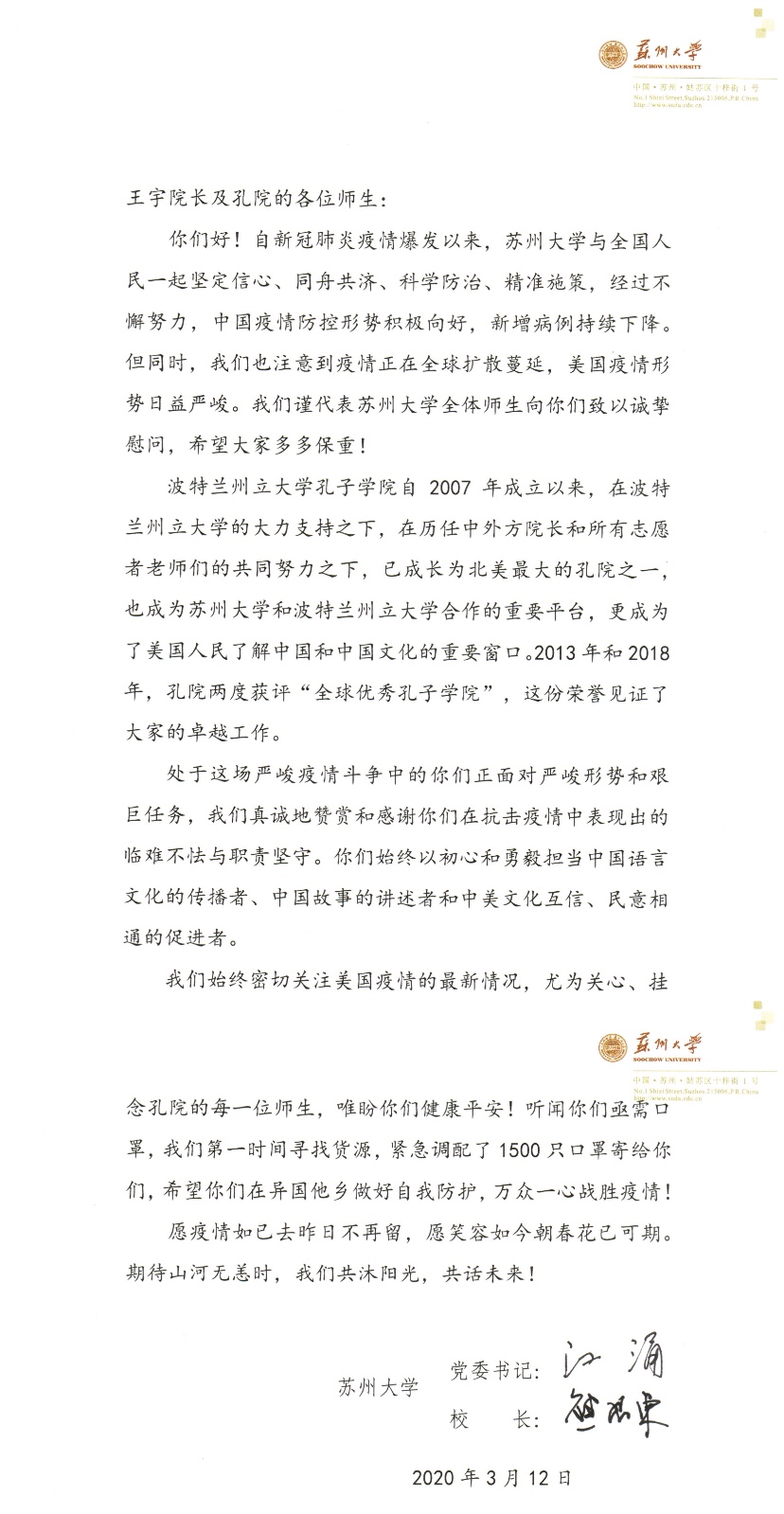3月12日,我校疫情防控领导小组副组长、保障工作组组长、党委常委周高总会计师紧急调配1500只医用级防护口罩,并在第一时间寄往波特兰州立大学孔子学院,与之一起寄出的是全体苏大人的祝福和期盼:愿全体海外汉语教师健康平安、无恙归来!