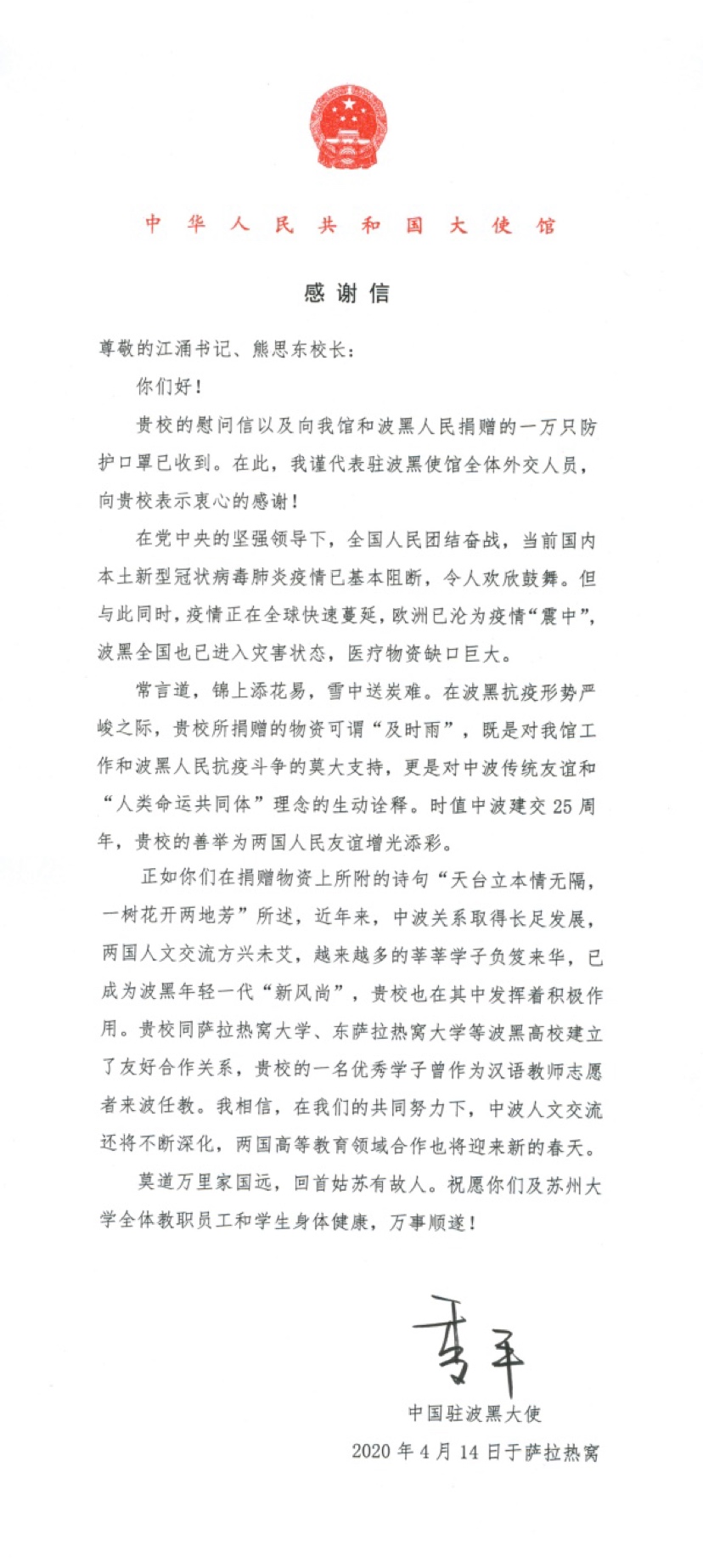 3.中国驻波黑大使馆向我校发来感谢信:莫道万里家国远,回首姑苏有故人。