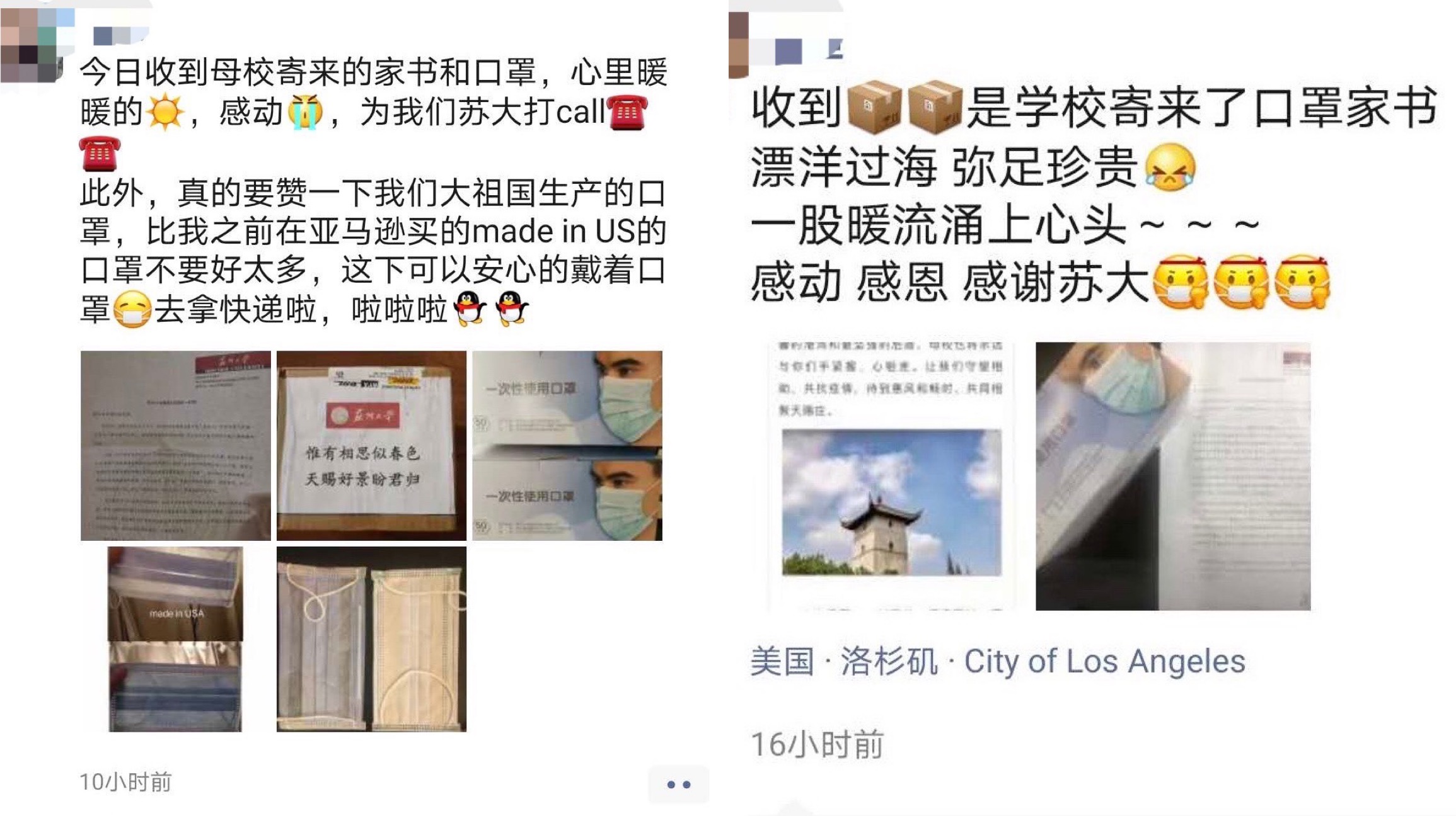 “今日收到母校寄来的家书和口罩,心里暖暖的,感动!为我们苏大打call”,“学校寄来了口罩、家书,漂洋过海,弥足珍贵,一股暖流涌上心头,感动!感恩!感谢苏大!”四月初,身处世界各地的境外师生陆续收到学校寄去的苏大“健康包”(一盒防护口罩与一封苏大家书),苏大人的朋友圈被“暖心苏大”四字频频刷屏。