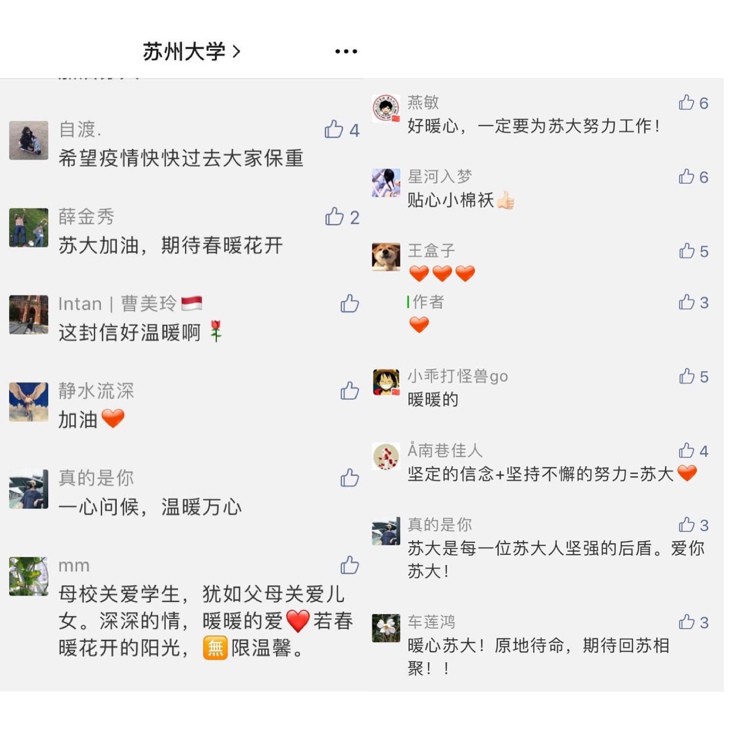 3月下旬,两封分别题为《苏州大学致境外同学的一封信》、《苏州大学致境外老师的一封信》(中英文版)在苏大官网和官方微信公众号上发表后,短短半小时内,浏览量迅速破万,读者们纷纷转发、点赞,更有读者留下暖心评论:
