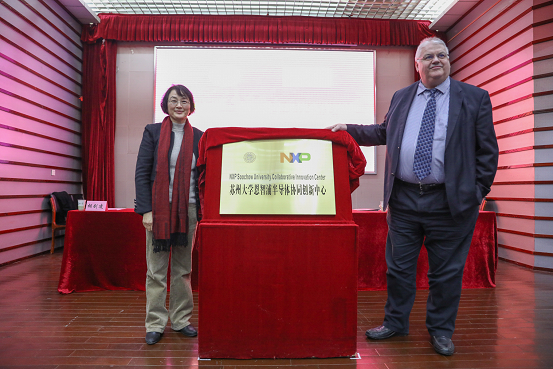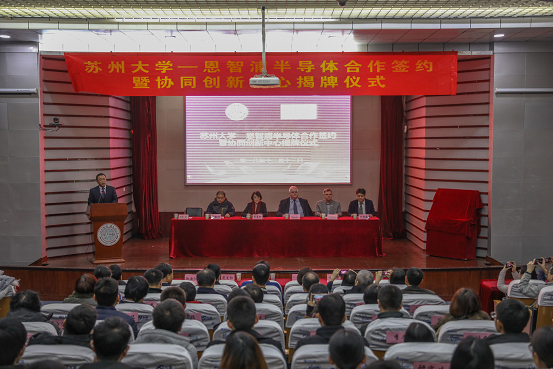 12月13日下午,苏州大学—恩智浦半导体合作签约暨协同创新中心揭牌仪式在天赐庄校区红楼会议中心学术报告厅举行。恩智浦半导体全球高级副总裁、微控制器事业部总经理Geoff Lees、全球副总裁Brian Branson、苏州研发中心总监万郁葱及公司相关负责人和研发团队,我校副校长蒋星红、“2011计划”办公室主任仇国阳、电子信息学院领导及师生代表出席了本次会议。会议由电子信息学院院长胡剑凌主持。