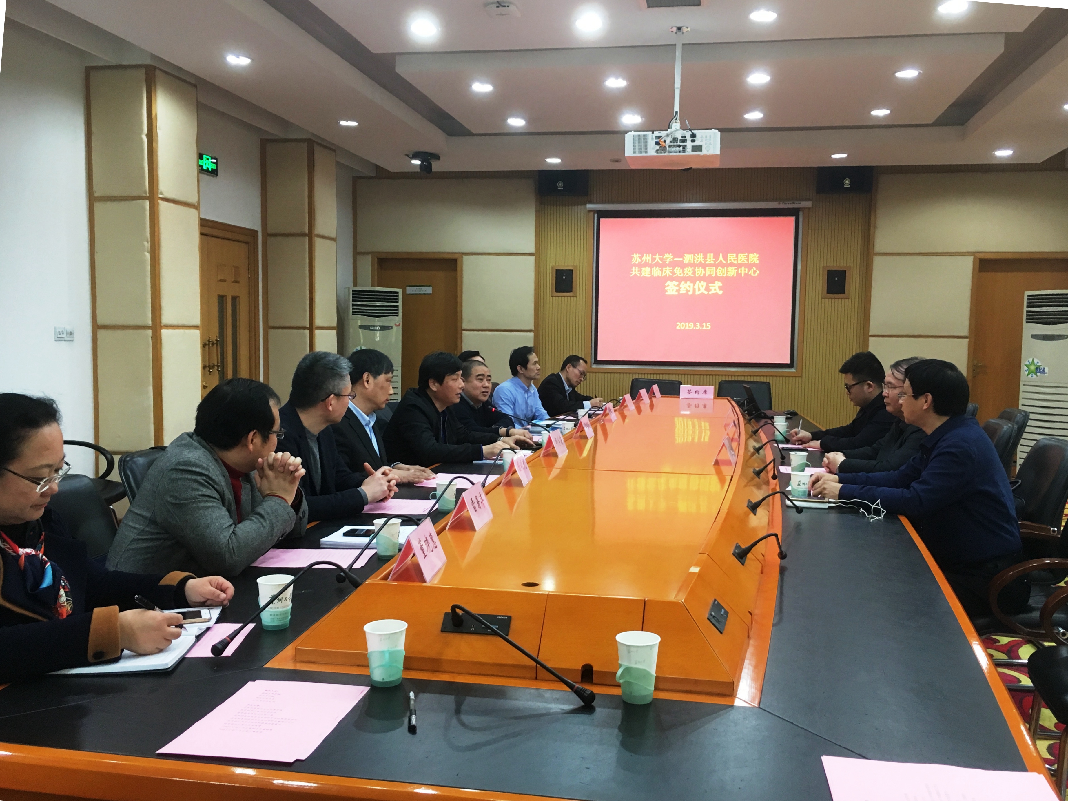 3月15日下午,“苏州大学-泗洪县人民医院临床免疫协同创新中心”签约仪式在我校红楼会议中心举行。泗洪县人民医院院长高明献、副院长朱冬承、办公室主任杜伟,我校科学技术研究院、医学部等相关人员参加签约仪式。签约仪式由“2011计划”办公室主任仇国阳主持。