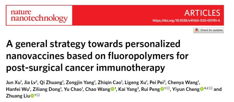 近日,功能纳米与软物质研究院刘庄教授、彭睿教授和华东师范大学程义云教授等人在Nature Nanotechnology上在线发表了题目为“A general strategy towards personalized nanovaccines based on fluoropolymers for post-surgical cancer immunotherapy”的研究成果,报道了一种基于氟化高分子(F13-PEI)个性化肿瘤疫苗的构建策略,用于术后肿瘤免疫治疗。经研究发现,F13-PEI与抗原组成的简单复合物不仅可以有效促进抗原在抗原递呈细胞中的胞质输送、显著增强对抗原的交叉呈递,还可以通过激活Toll 样受体4(TLR4)刺激产生细胞因子,从而显著增强该纳米疫苗的抗癌效应。