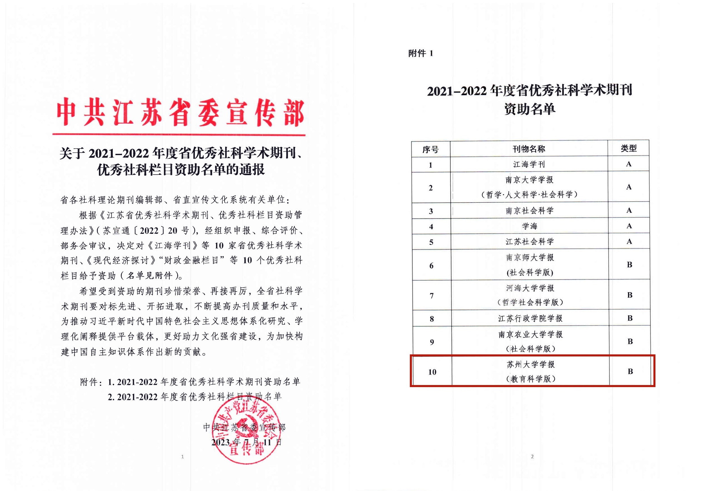 为进一步加强学术期刊建设,着力提升学术期刊内容质量和传播力影响力,江苏省委宣传部根据《江苏省优秀社科学术期刊、优秀社科栏目资助管理办法》,经组织申报、综合评价、部务会审议,此次共评选出10家省优秀社科学术期刊以及10个优秀社科栏目并予以资助。《苏州大学学报(教育科学版)》首次入选省优秀社科学术期刊,此前该刊“理论前沿”栏目两度被评为省社科理论期刊优秀栏目。