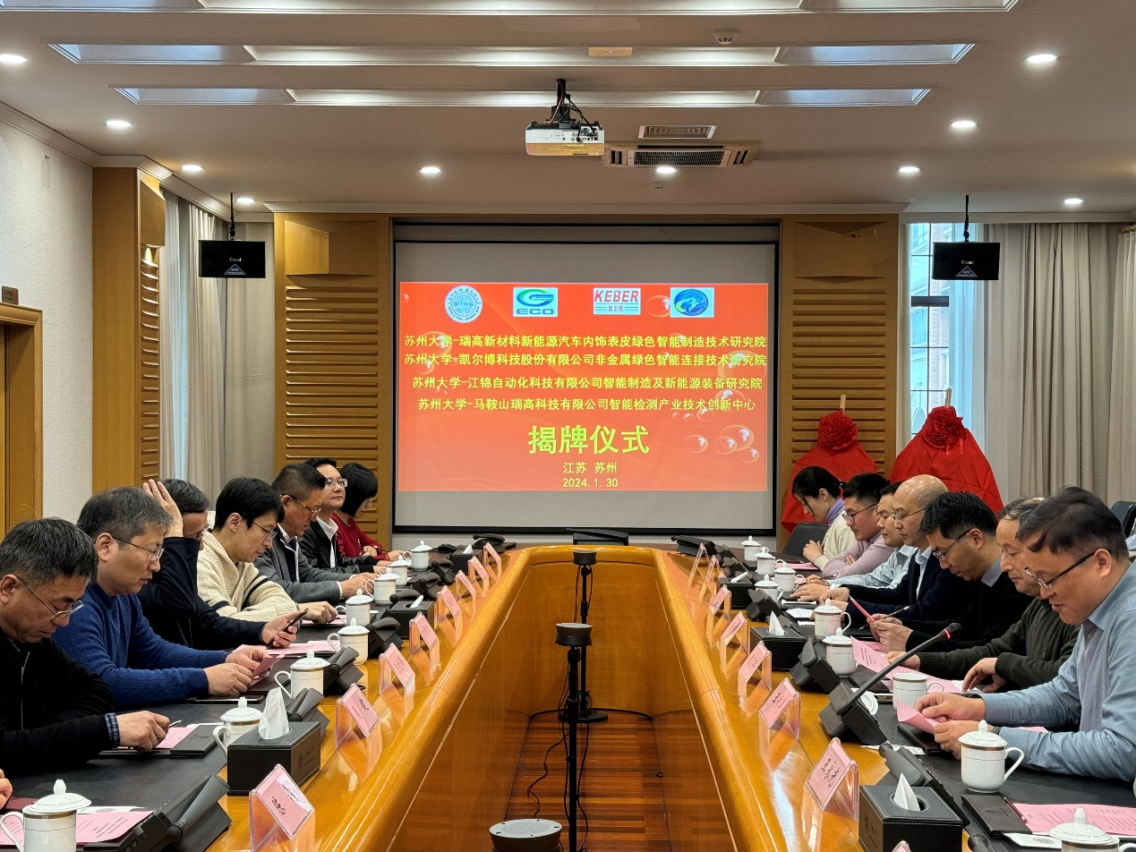 1月30日下午,苏州大学-苏州瑞高新材料股份有限公司新能源汽车内饰表皮绿色智能制造技术研究院、苏州大学-凯尔博科技股份有限公司非金属绿色智能连接技术研究院、苏州大学-江锦自动化科技有限公司智能制造及新能源装备研究院、苏州大学-马鞍山瑞高科技有限公司智能检测产业技术创新中心等校企创新联合体揭牌仪式在天赐庄校区红楼会议中心举行。