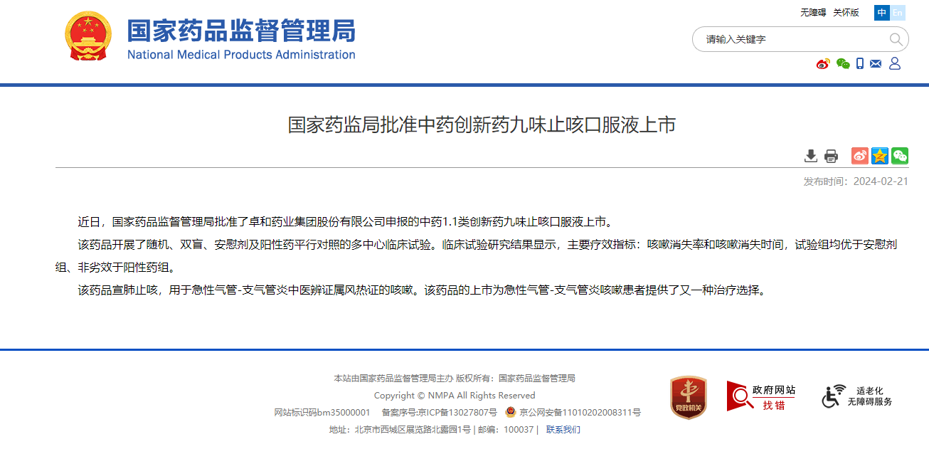 近日,从国家药品监督管理局网站获悉,由我校苏州医学院药学院中药系主任玄振玉教授主导研制的1.1类创新药九味止咳口服液获批上市。该药作为一款获批上市的中药创新药,为急性气管-支气管炎咳嗽患者提供了又一种治疗选择。