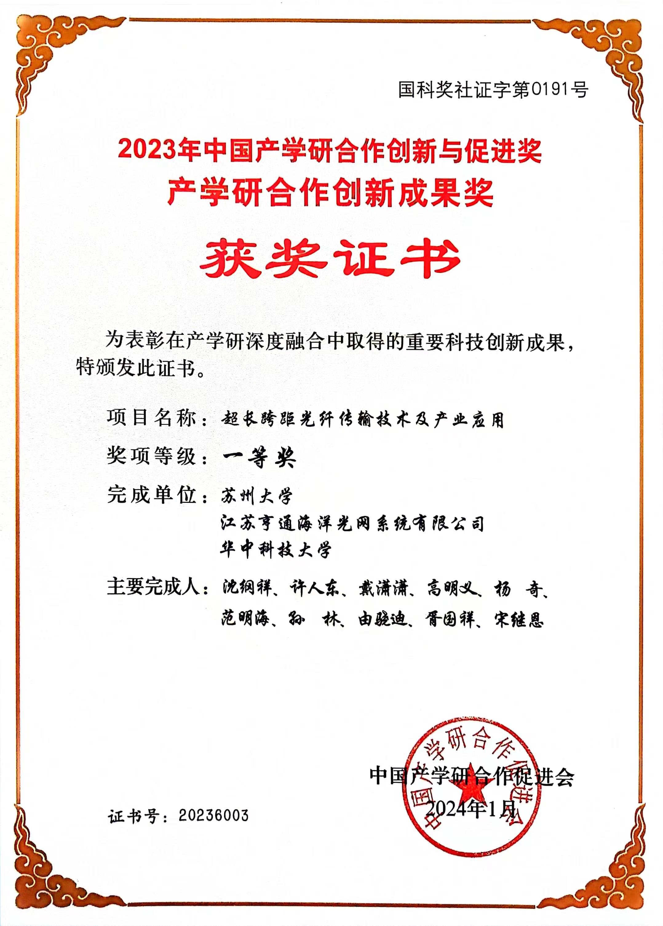 3月17日,中国产学研合作促进会在北京会议中心举行2023年中国产学研合作创新与促进奖颁奖仪式。以苏州大学为第一完成单位,联合江苏亨通海洋光网系统有限公司和华中科技大学的“超长跨距光纤传输技术及产业应用”项目荣获2023年中国产学研合作创新成果奖一等奖,我校电子信息学院沈纲祥教授为获奖成果的第一完成人。此次获奖是对我校光通信网络团队在产学研合作和成果转化工作方面取得成绩的充分肯定。