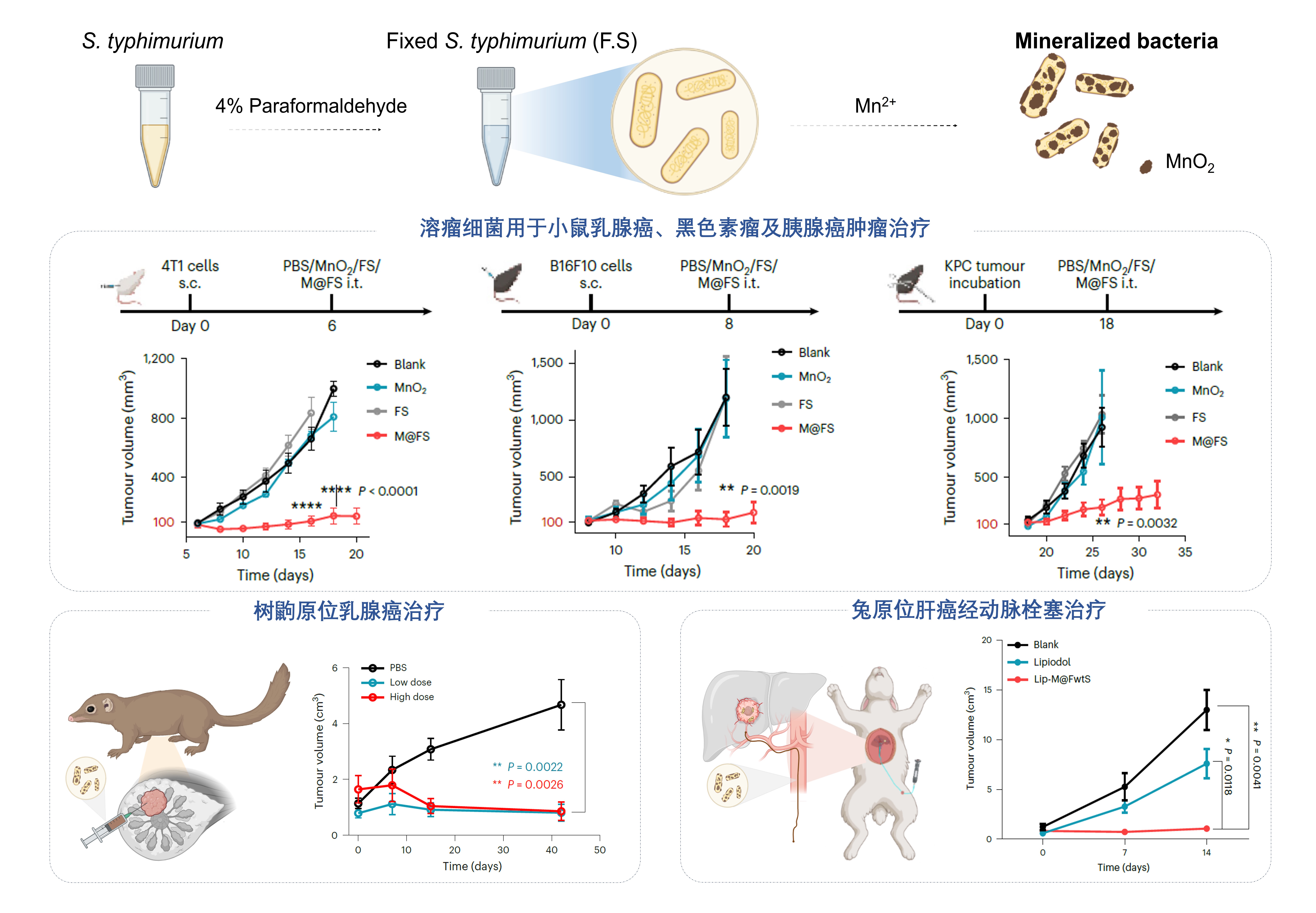 针对上述挑战,刘庄、彭睿与赵永祥、钟莉娉合作开发了一种新型肿瘤治疗策略,通过在灭活的沙门氏菌表面“种植”二氧化锰纳米结构,制备了一种特殊的溶瘤矿化细菌,用来对抗癌症。这种溶瘤矿化细菌生物安全性很高,在小鼠乳腺癌、结肠癌、黑色素瘤、胰腺癌以及兔肝癌等肿瘤模型中均表现出显著疗效。它能够有效地激活多条先天性免疫通路,调控肿瘤微环境,促进免疫细胞浸润并诱导肿瘤特异性免疫反应和远隔抗肿瘤效应。治愈的动物还能获得免疫记忆,有利于抑制肿瘤复发。更令人鼓舞的是,这种治疗方法的疗效在临床相关性更好的灵长类近亲动物——树鼩的原发性乳腺癌模型中也得到了验证,有1/3的荷瘤树鼩在接受治疗后完全康复。此外,研究团队还尝试利用临床经动脉介入栓塞(TAE)技术,将溶瘤矿化细菌作为 TAE 治疗剂,用于兔子的肝癌治疗,明显抑制了肿瘤生长,为溶瘤矿化细菌策略进一步拓展了临床给药途径。