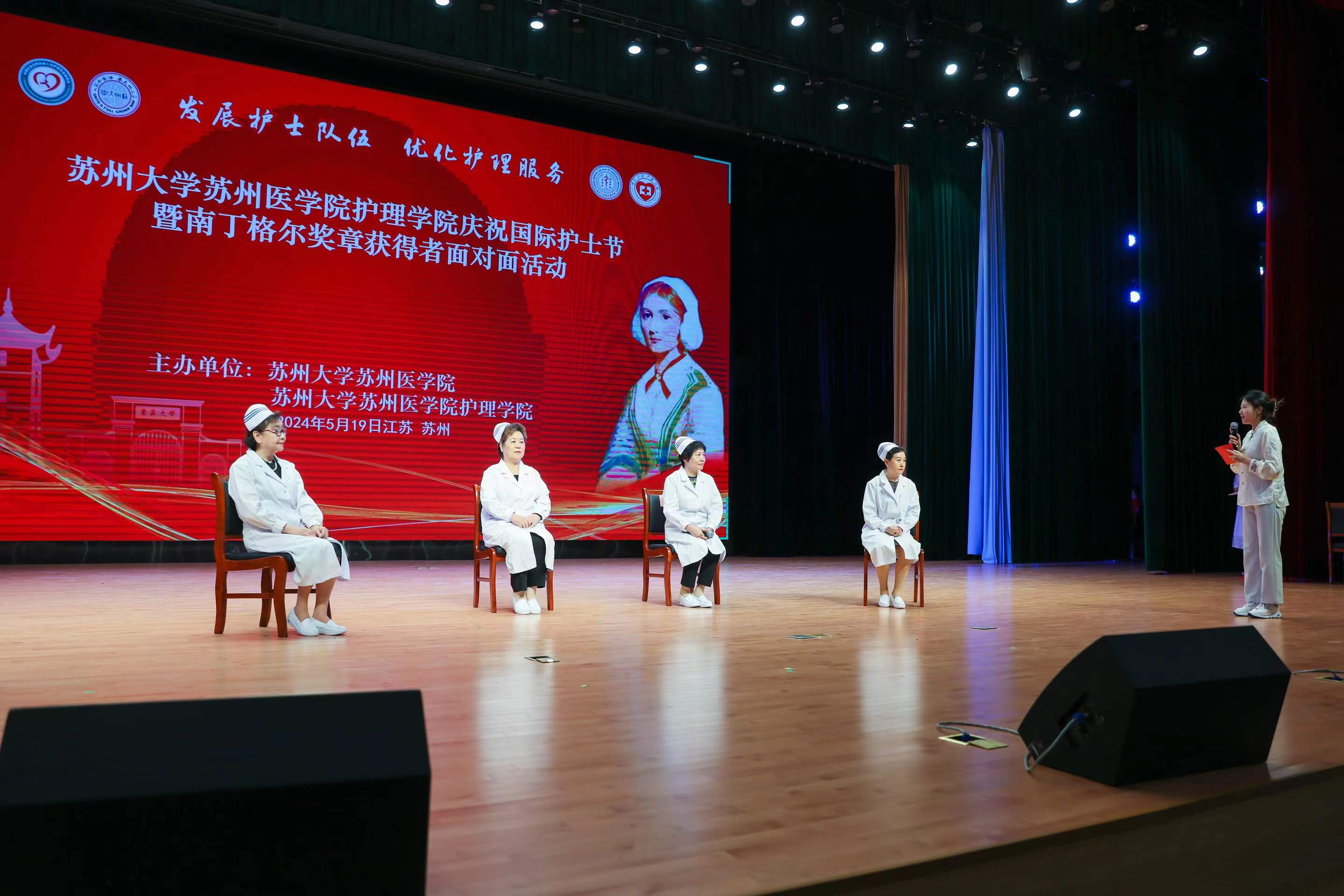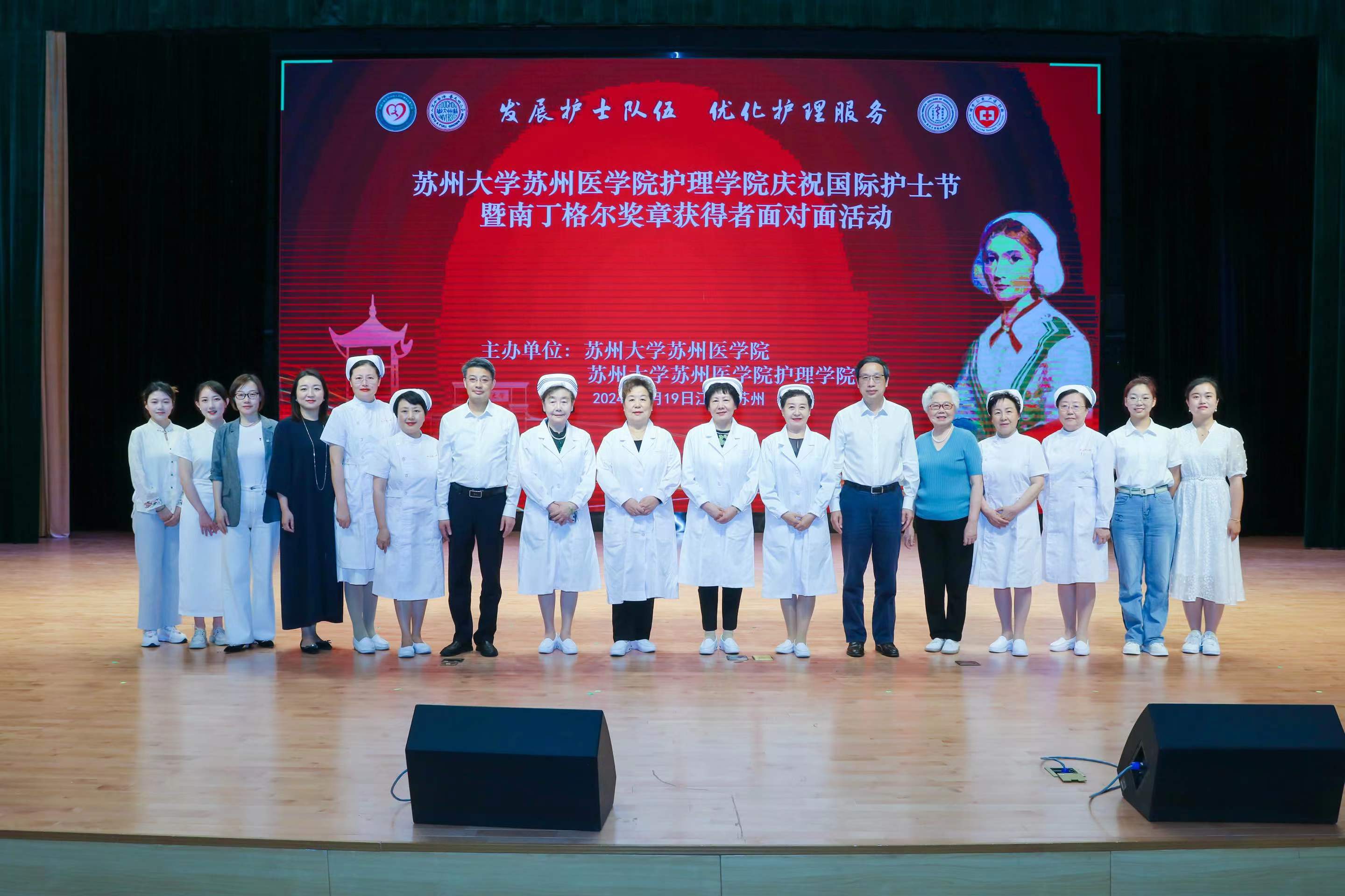 5月19日下午,庆祝国际护士节暨南丁格尔奖章获得者面对面活动在存菊堂举行。四位南丁格尔奖章获得者——中华护理学会理事长吴欣娟、中华护理学会高等护理教育专委会主任委员姜小鹰、四川大学华西医院原护理部主任成翼娟和青海省人民医院终身名誉院长、中华护理学会副理事长赵生秀,我校党委副书记邓敏,中国红十字会原副会长、我校国际红十字学院院长王汝鹏,苏州医学院护理学院首任院长薛小玲,督导孙志敏,苏州医学院党工委副书记兼副院长孟玲玲,护理学院党委书记刘慧,护理学院副院长田利等领导、专家及学院全体师生参加活动。活动由李惠玲主持。