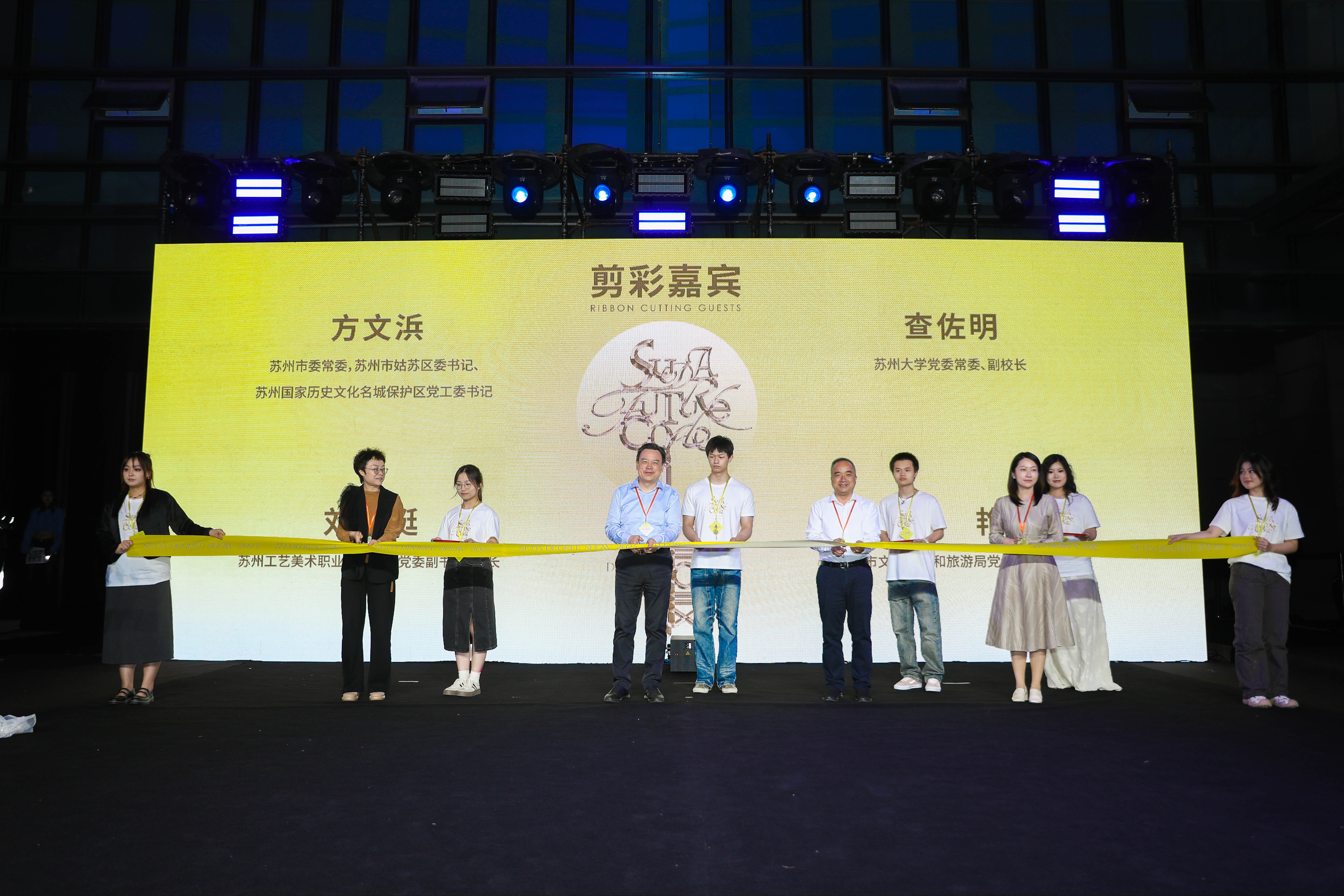 开幕式上,与会嘉宾为获奖学生颁发贺野艺术教育新秀奖、苏州大学艺术学院2024届本科优秀毕业作品奖以及优秀毕业作品单项奖。方文浜、查佐明、刘珽、朱艳上台剪彩,服装与服饰设计毕业秀就此开启。