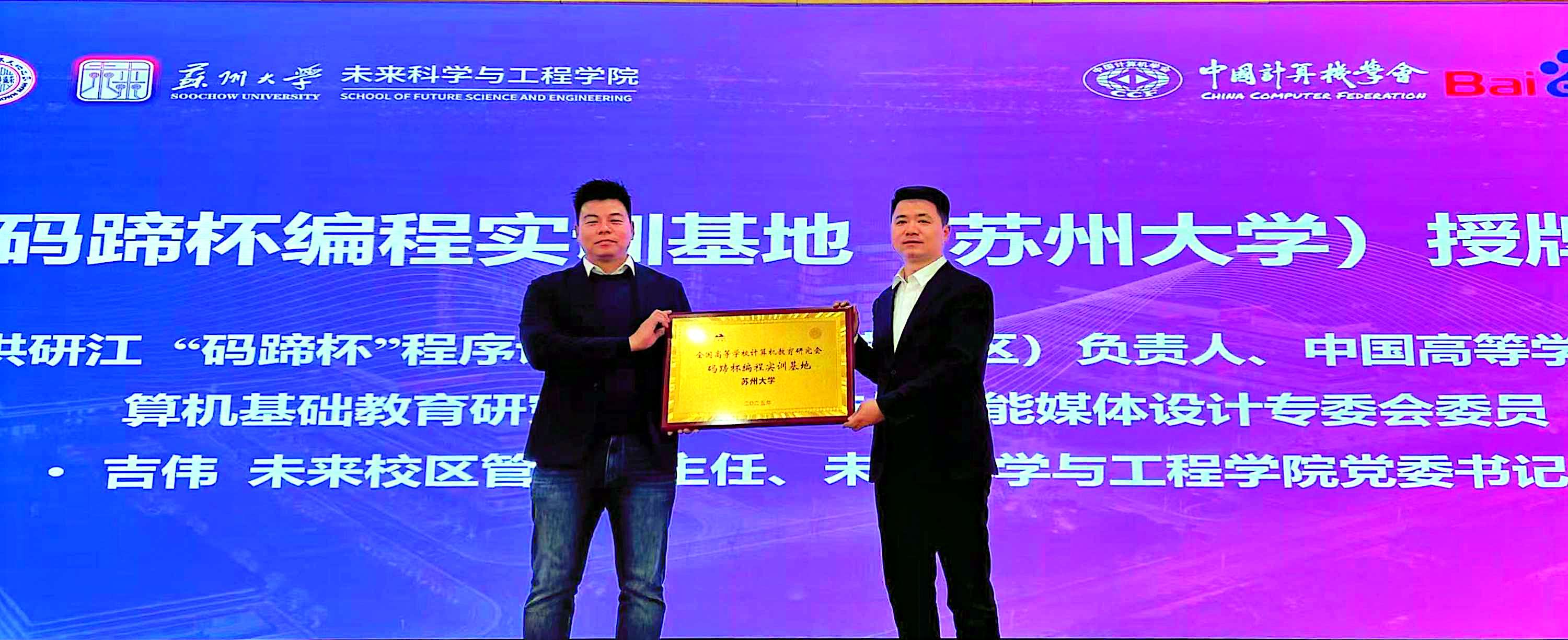 为进一步整合资源,推动人才培养向创新化、实践化和高质量方向发展,我校与中国高等学校计算机教育研究会合作共建码蹄杯编程实训基地(苏州大学),会上举行了授牌仪式。