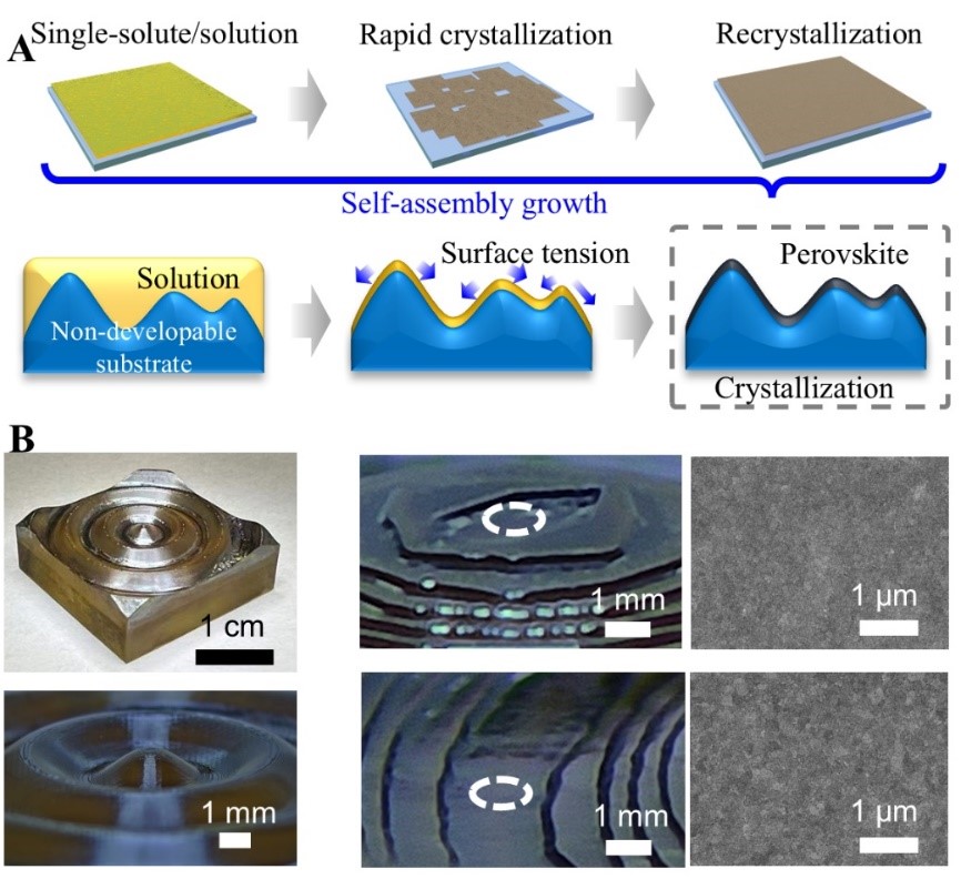 围绕这一关键瓶颈问题,李亮研究团队创新性地提出了一种基于单溶质/溶液体系的快速结晶成膜策略(图A)。该方法利用高密度成核机制,成功实现了在三维非规则结构基底上的原位沉积高质量钙钛矿薄膜。该薄膜在不同空间位置均展现出高度均匀的微观形貌和一致的厚度分布(图B)。更重要的是,该薄膜生长策略展现出广泛的适应性,适用于多种结构类型与尺度的基底,其尺寸范围从亚微米级延伸至分米级,跨越六个数量级。结合先进的3D打印技术与功能层结构的精确匹配设计,研究团队进一步实现了对不可拓展结构光电阵列在微米尺度上的空间构型调控,并成功验证了其在光电成像过程中的像差校正能力(图C)。这一成果不仅为复杂结构基底上半导体薄膜的可控生长提供了全新的解决方案,也为实现高集成度、高性能的新型光电成像系统奠定了坚实基础。