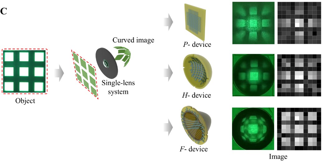 图(C)单透镜成像系统下,拟合曲面光电阵列(F-)对像差的矫正效果及其与传统平面(P-)和半球型(H-)器件的对比