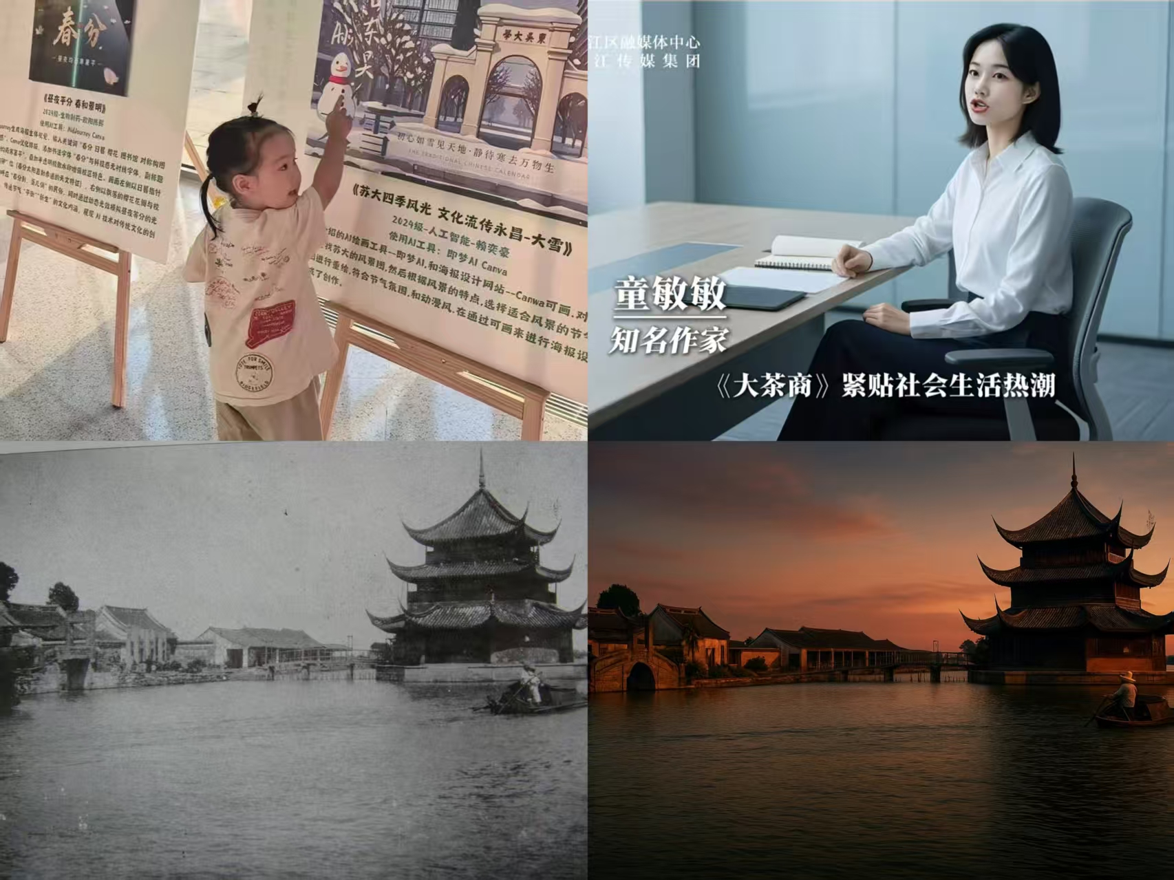 “X+AI”人工智能基础通识课程是未来科学与工程学院在全校率先开展的产教深度融合特色的人工智能基础通识教育体系课程之一,以“AIGC +全媒体” 融合技术应用为切入点,旨在提升各专业学生的创新思维和AI素养,为培养面向未来的复合型创新人才提供了新思路新模式。目前已为校内外多家单位的场景应用赋能,在吴江“苏州湾四季share书”仲夏书影市集活动中,运用AIGC技术创作出科技与人文交融的二十四节气海报作品,在第十五届江苏书展暨“2025苏州文学周”重点活动中,以AI数字人荐书《大茶商》,用AI技术为黎里古镇史上著名景观“黎川八景”黑白照片进行高清色彩修复,为传统文学破圈传播寻求创新实践。