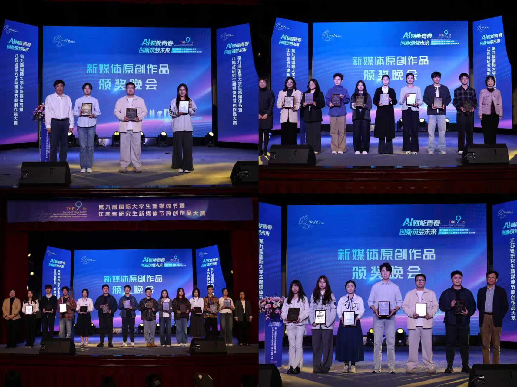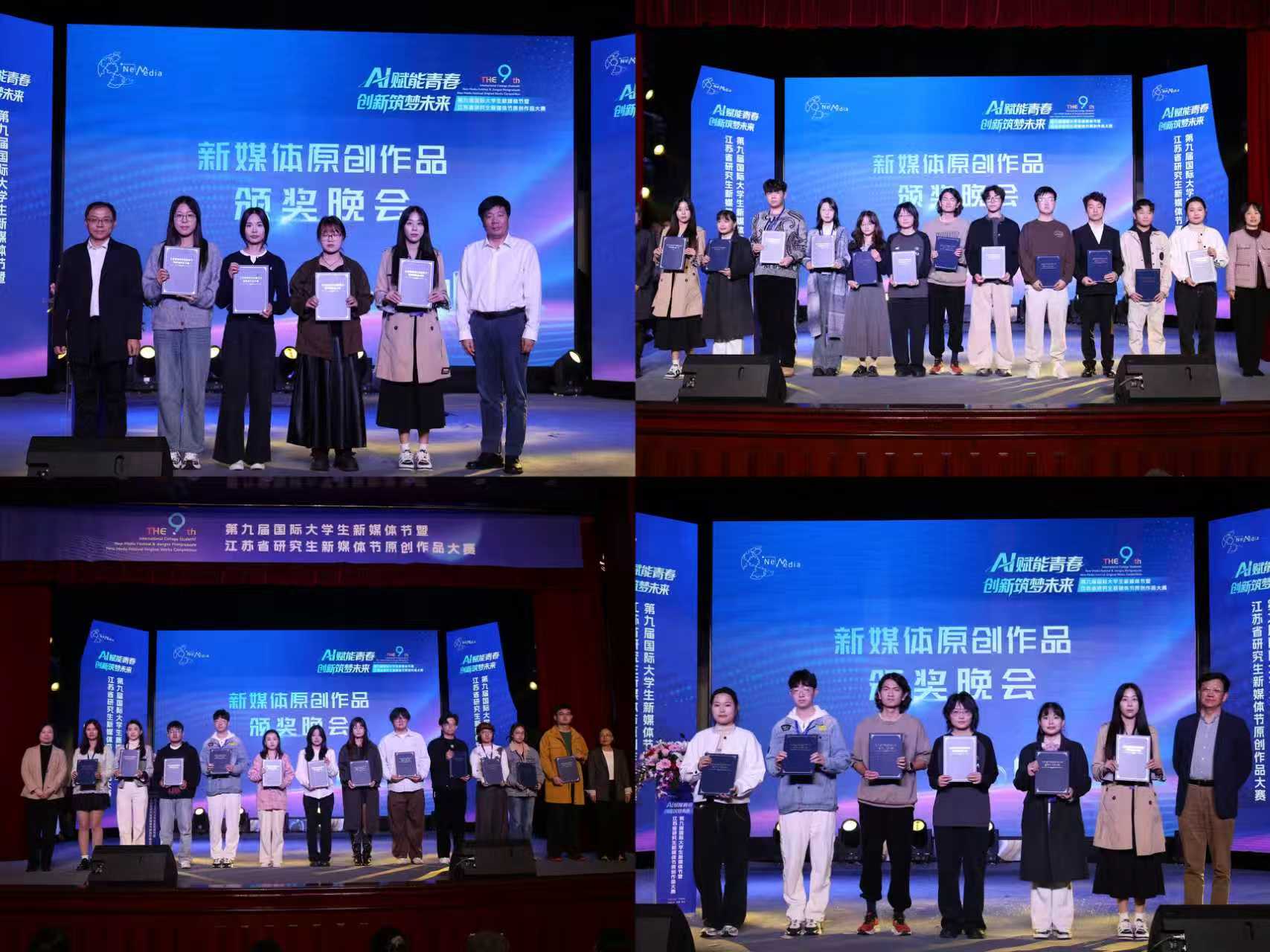 本届国际大学生新媒体节暨原创作品大赛以“AI赋能青春,创新筑梦未来”为主题,共收到海内外120余所高校的615件参赛作品,评出一等奖3项,二等奖8项,三等奖15项,优秀奖55项,优秀组织奖6项。江苏省研究生新媒体节暨原创作品大赛围绕“AI启新思,研路创未来”主题,共征集到省内高校研究生作品267件,评出一等奖4项,二等奖12项,三等奖20项,优秀奖38项,优秀组织奖6项。新媒体原创作品颁奖晚会上,我校相关部门及学院负责人为获奖作者及单位颁奖。