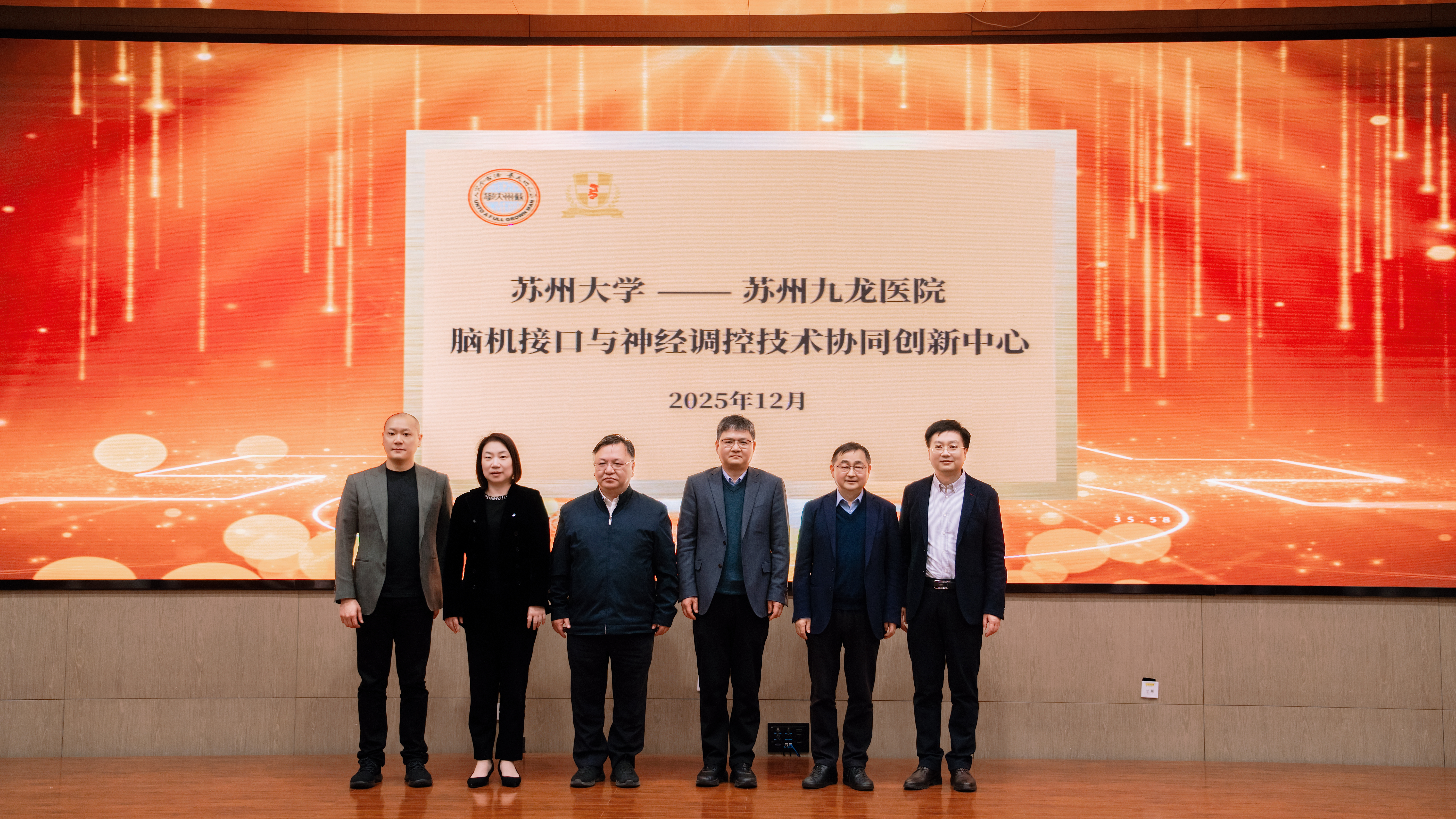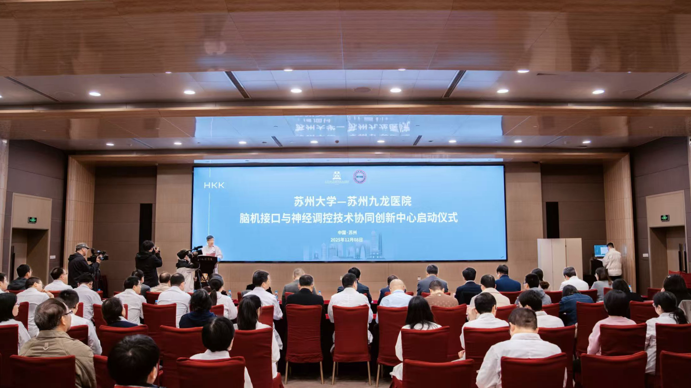 12月8日,苏州大学—苏州九龙医院脑机接口与神经调控技术协同创新中心(以下简称“协同中心”)启动仪式举行。市卫健委二级调研员、市医院协会会长沈洁,工业园区卫健委党组书记、主任冯彬,香港九龙集团董事长孙曦,苏州九龙医院院长钱海鑫、常务副院长刘进炼,我校科技党委书记、科学技术研究院副院长刘开强,神经科学研究所所长、协同中心主任刘春风,神经科学研究所副所长刘耀波等出席活动。