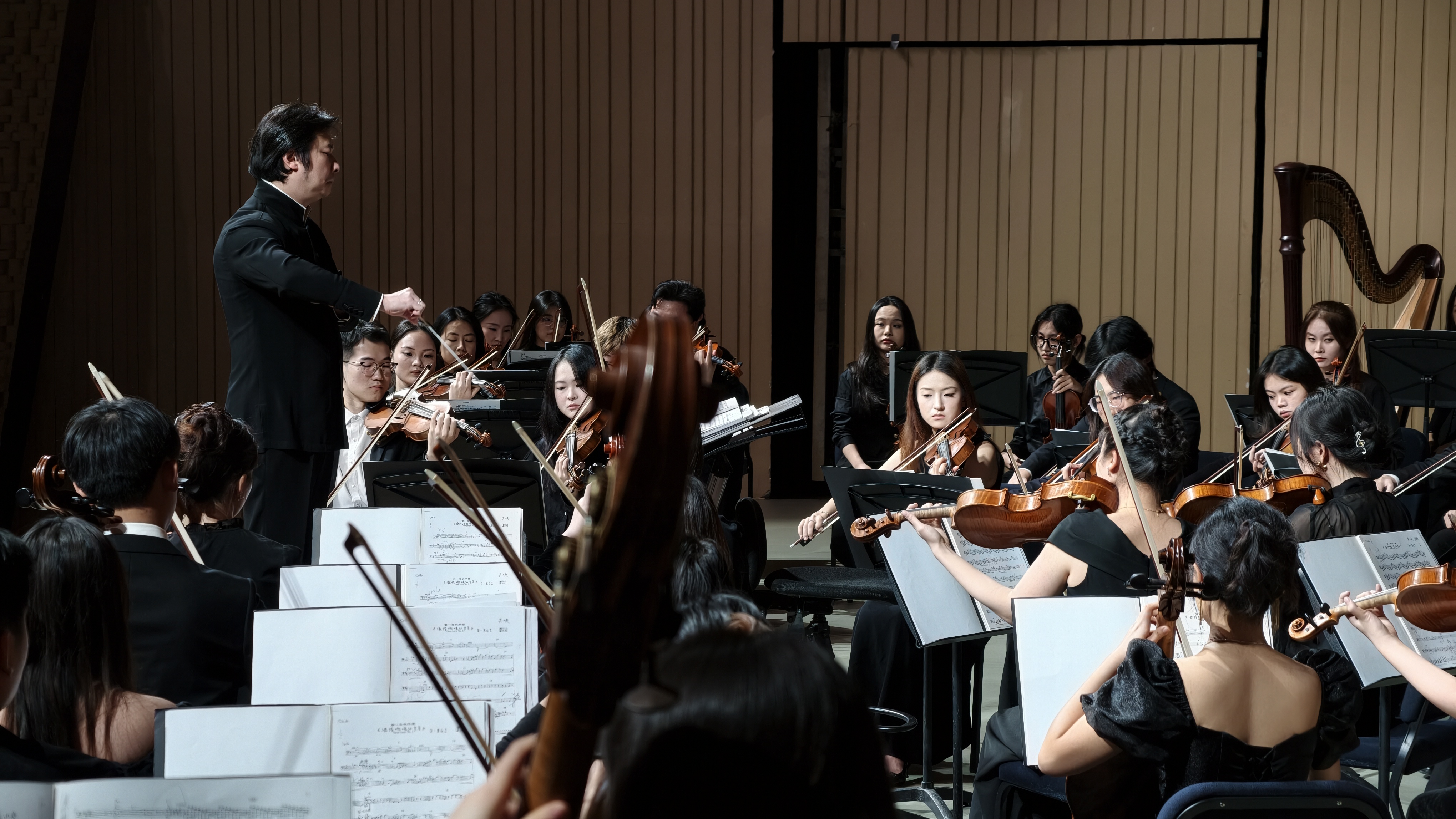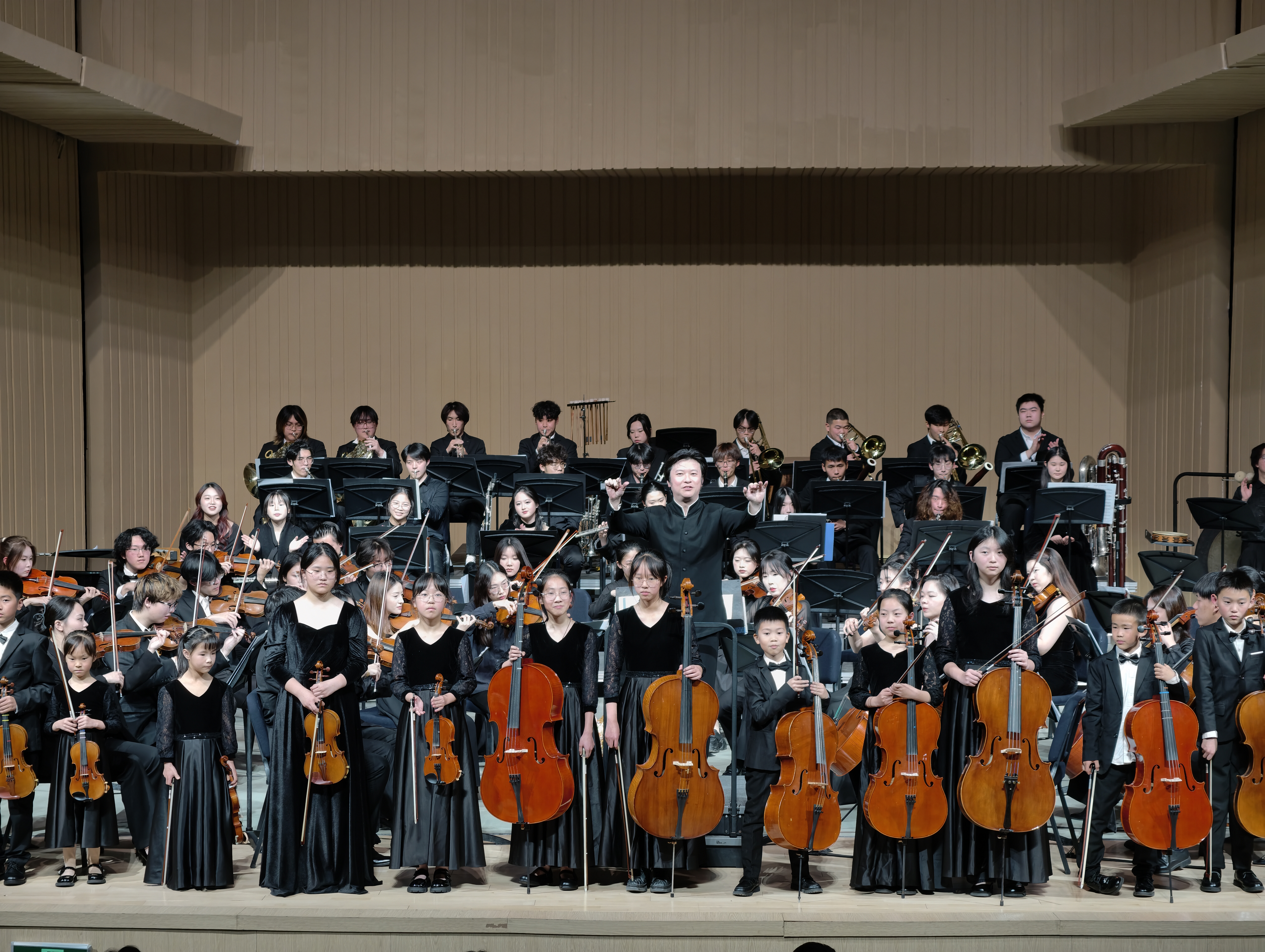 音乐会的压轴曲目,是由我校交响乐团与吴江盛唐青少年乐团联袂呈现的《瑶族舞曲》。两团乐手同台协作,青年学子的专业素养与青少年的蓬勃朝气交相辉映。这曲经典的民族乐曲,不仅是对中华优秀传统文化的深情致敬与生动传承,更象征着音乐在代际之间的温暖传递与交融。