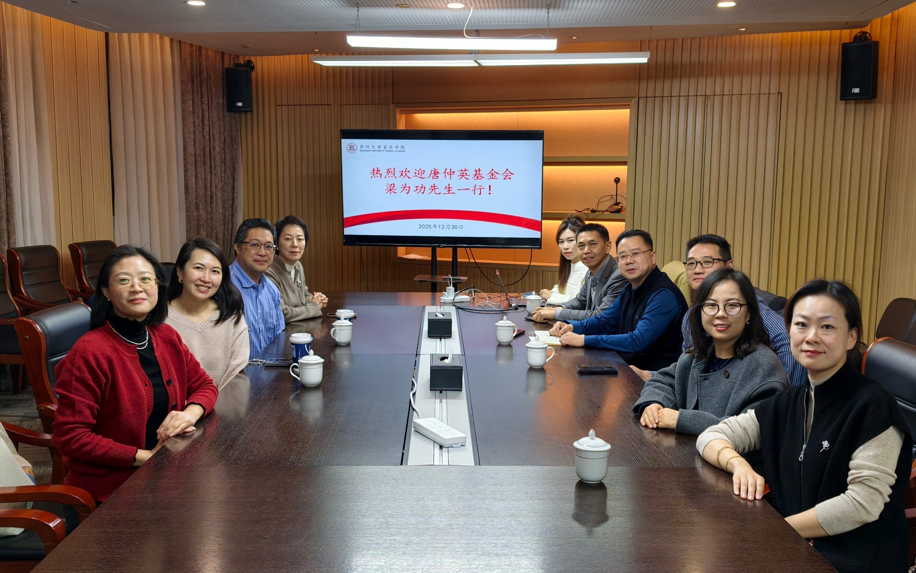 音乐会前,我校国内发展合作处处长程晓军及音乐学院领导班子接待了唐仲英基金会梁为功一行,并举行了交流座谈会。双方回顾了既往良好合作,并就筹备中的2026CTF中美音乐夏令营等未来合作进行了重点交流。