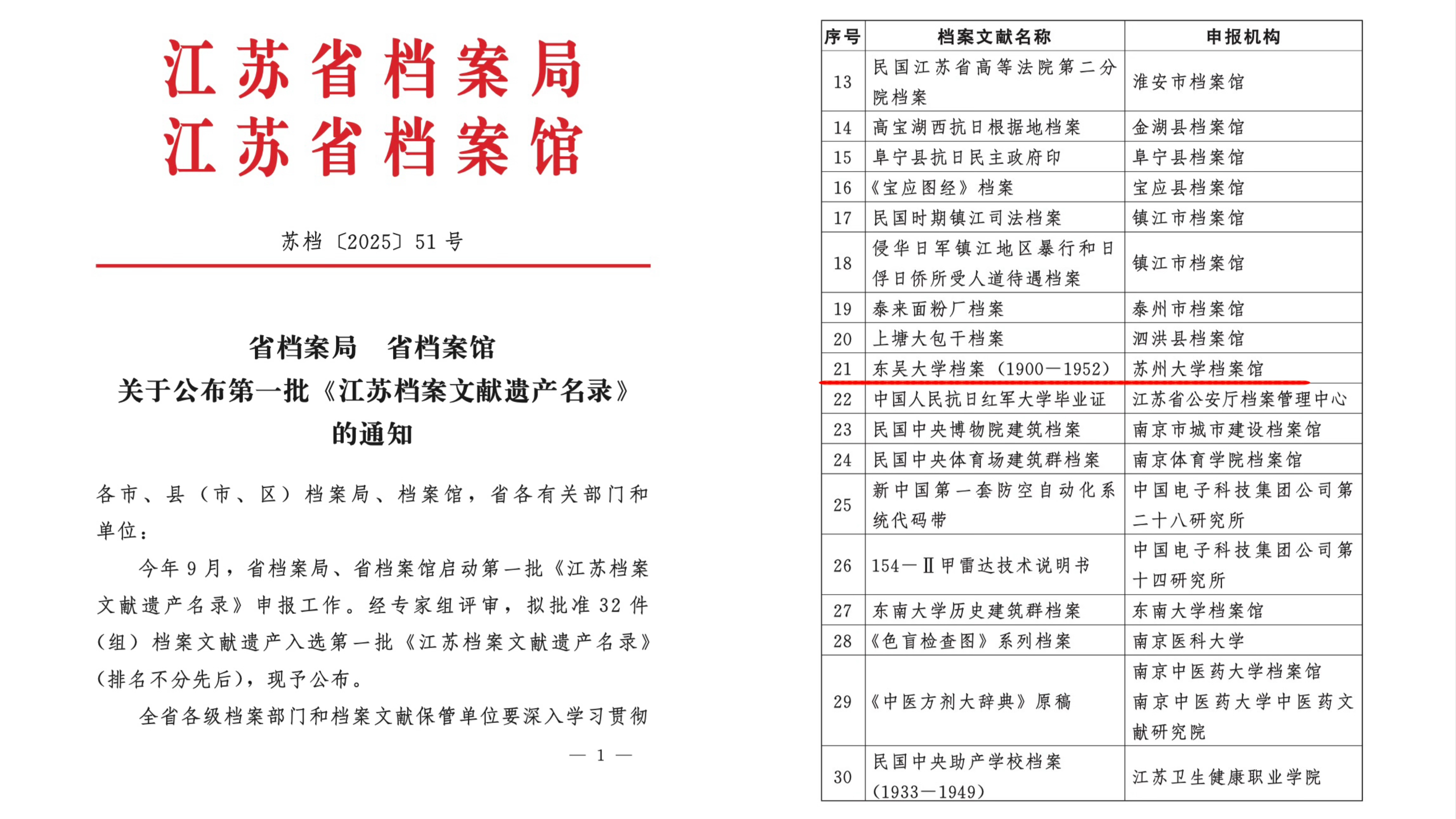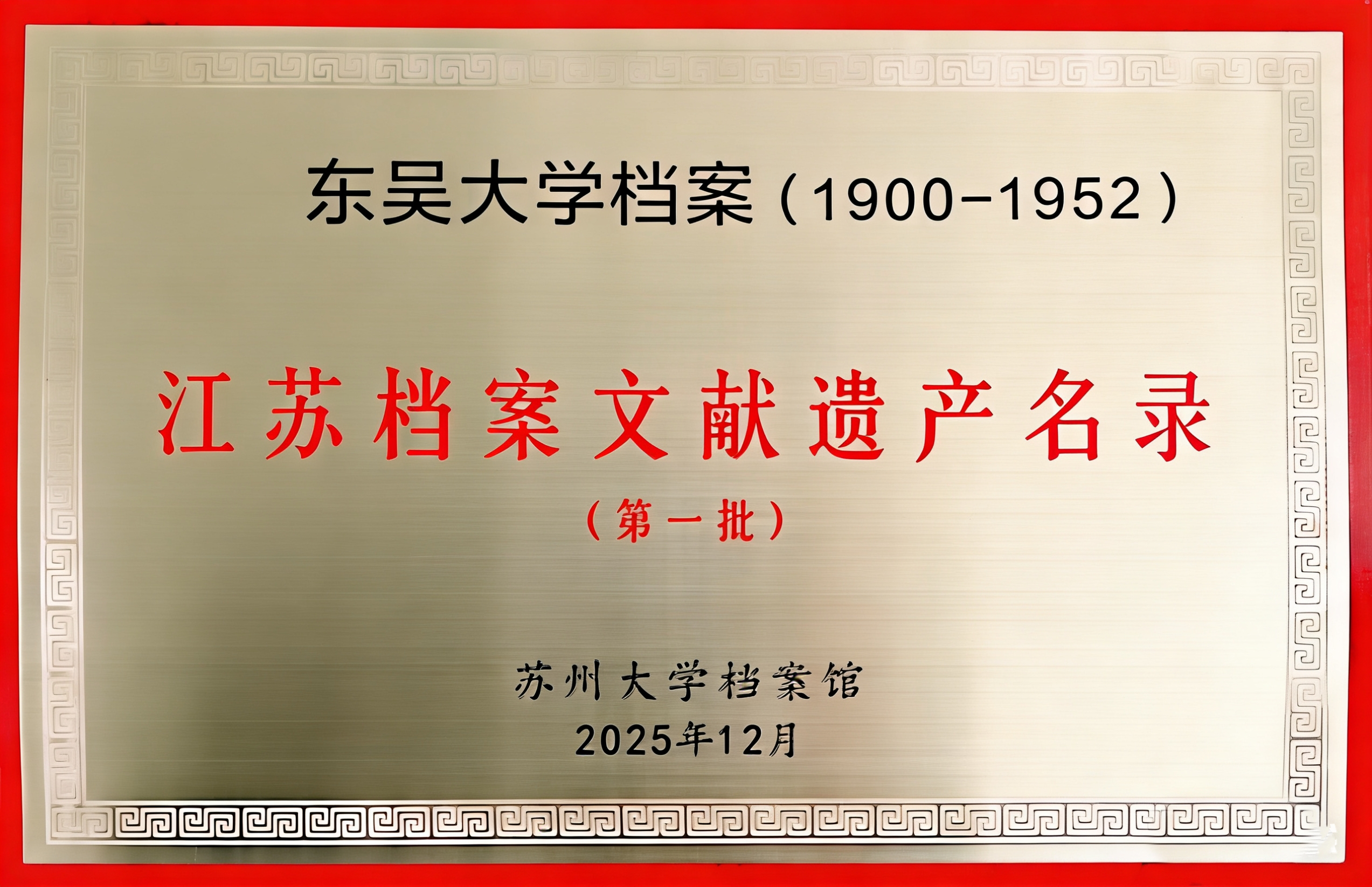 近日,江苏省档案局、江苏省档案馆正式公布第一批《江苏档案文献遗产名录》,全省共32组珍贵档案文献入选。由我校档案馆申报的“东吴大学档案(1900—1952)”荣列其中,成为名录中为数不多的高校档案代表,也是唯一一套以完整高校前身整体档案形式入选的珍贵文献遗产。