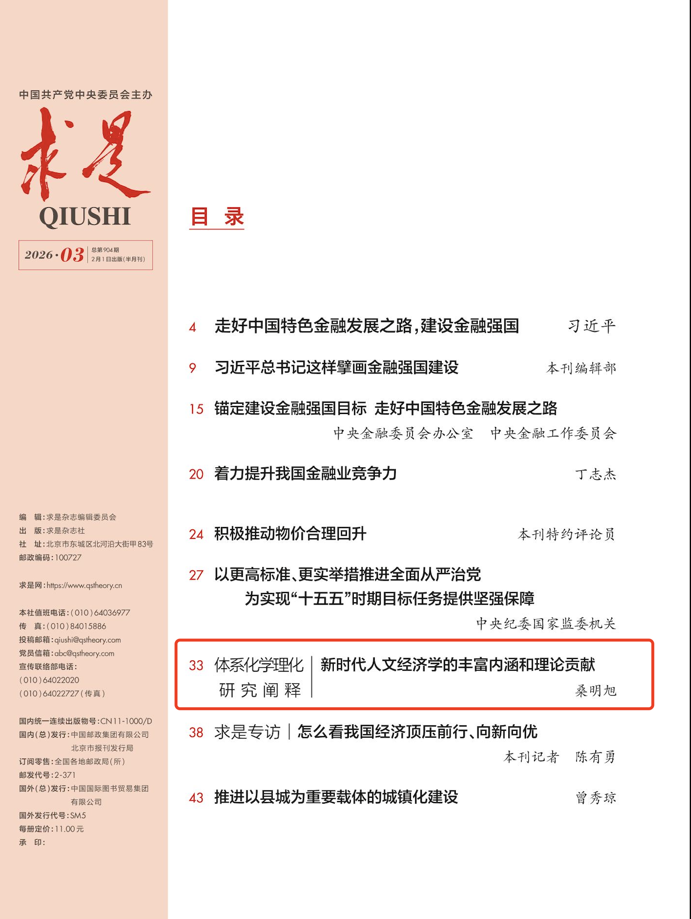2月1日出版的《求是》杂志(2026年第3期),刊发了我校政治与公共管理学院桑明旭教授的理论文章《新时代人文经济学的丰富内涵和理论贡献》。