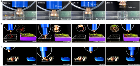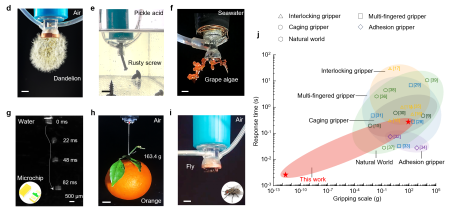 联合团队设计了一种“环境无关的表面活性调控机构”,通过多孔表面与微通道结构,使抓手在空气、海水、酸碱溶液等多种环境中均能稳定工作。同时,抓手可在200毫秒内捕获快速爬行的蟑螂,并能进行无视觉辅助的无序抓取任务,展现出极强的动态适应能力。
