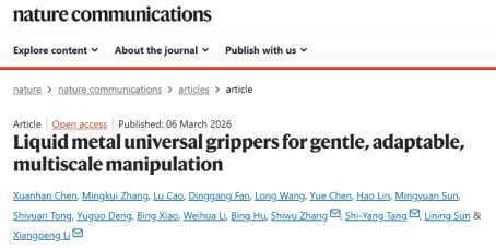 近日,我校机电工程学院李相鹏教授、孙立宁教授团队联合中国科学技术大学张世武教授、新南威尔士大学唐诗杨教授等国际团队,在《自然-通讯》(Nature Communications)上发表了题为“Liquid metal universal grippers for gentle, adaptable, multiscale manipulation”的研究论文。机电工程学院博士研究生陈宣翰、硕士研究生张明奎为论文共同第一作者,李相鹏、孙立宁为通讯作者。